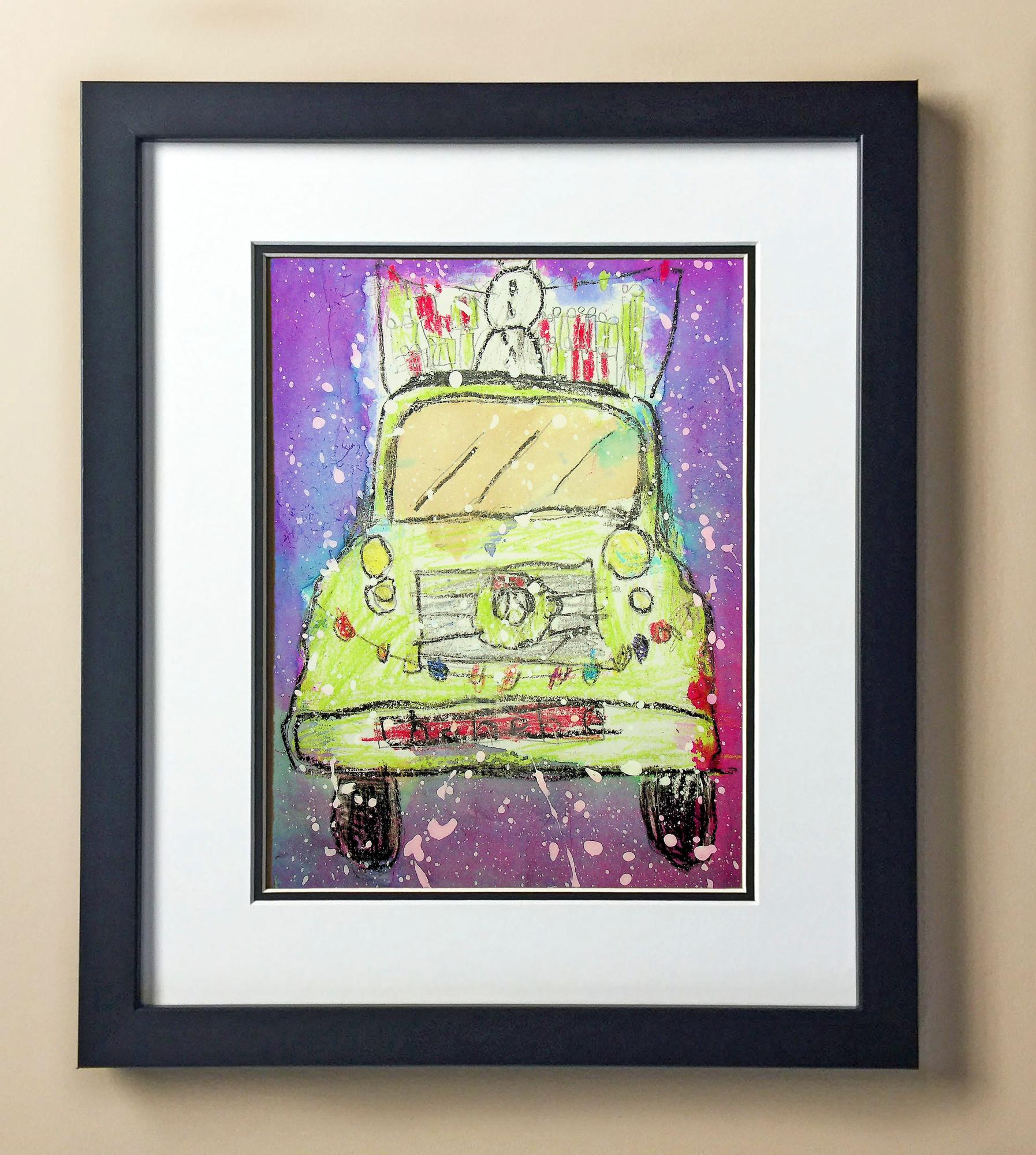 Included with the purchase is the Students Artwork, Frame, double matboard, shatter proof plexiglass, and a ready to hang backerboard with turnbuttons