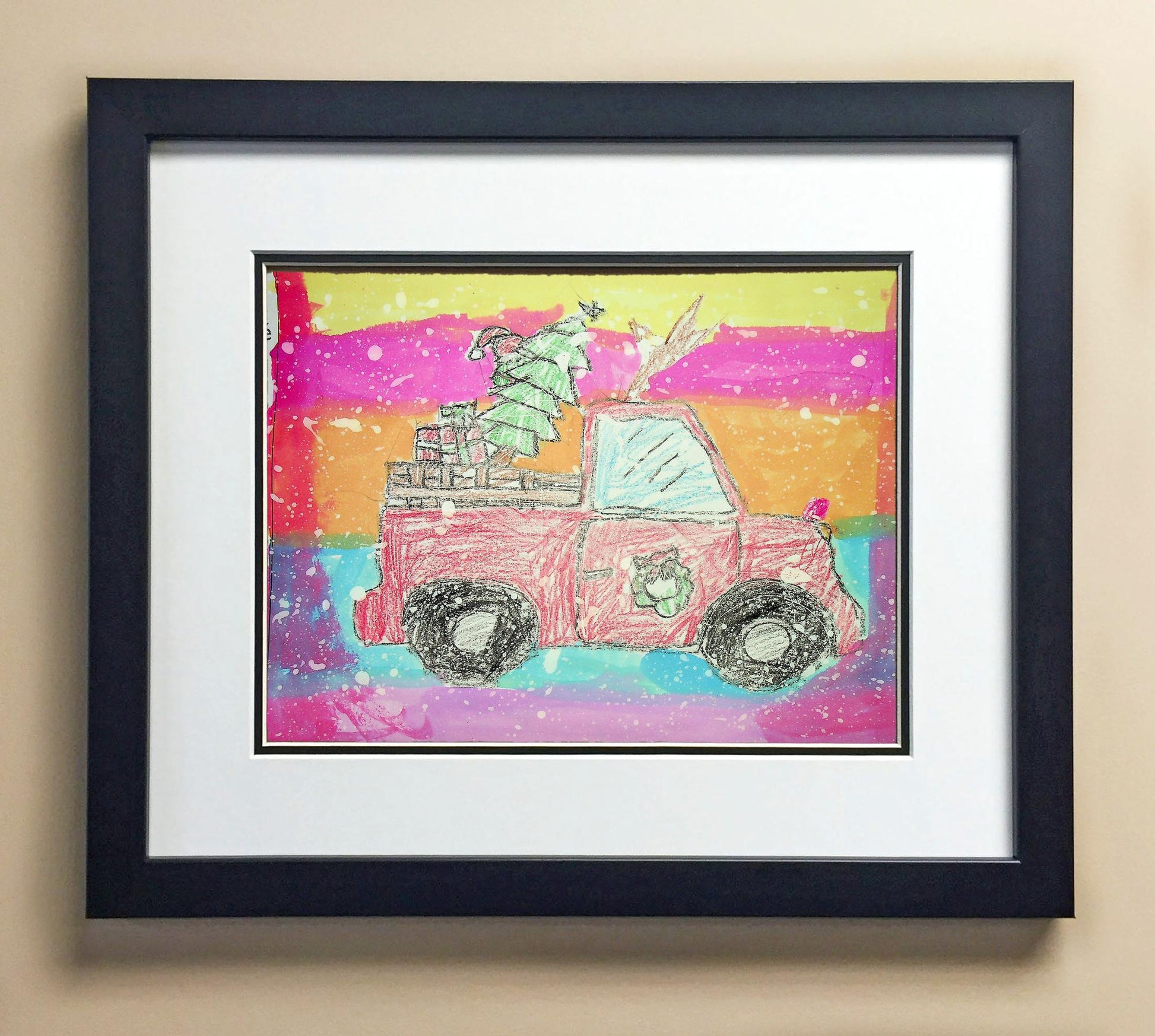 Included with the purchase is the Students Artwork, Frame, double matboard, shatter proof plexiglass, and a ready to hang backerboard with turnbuttons