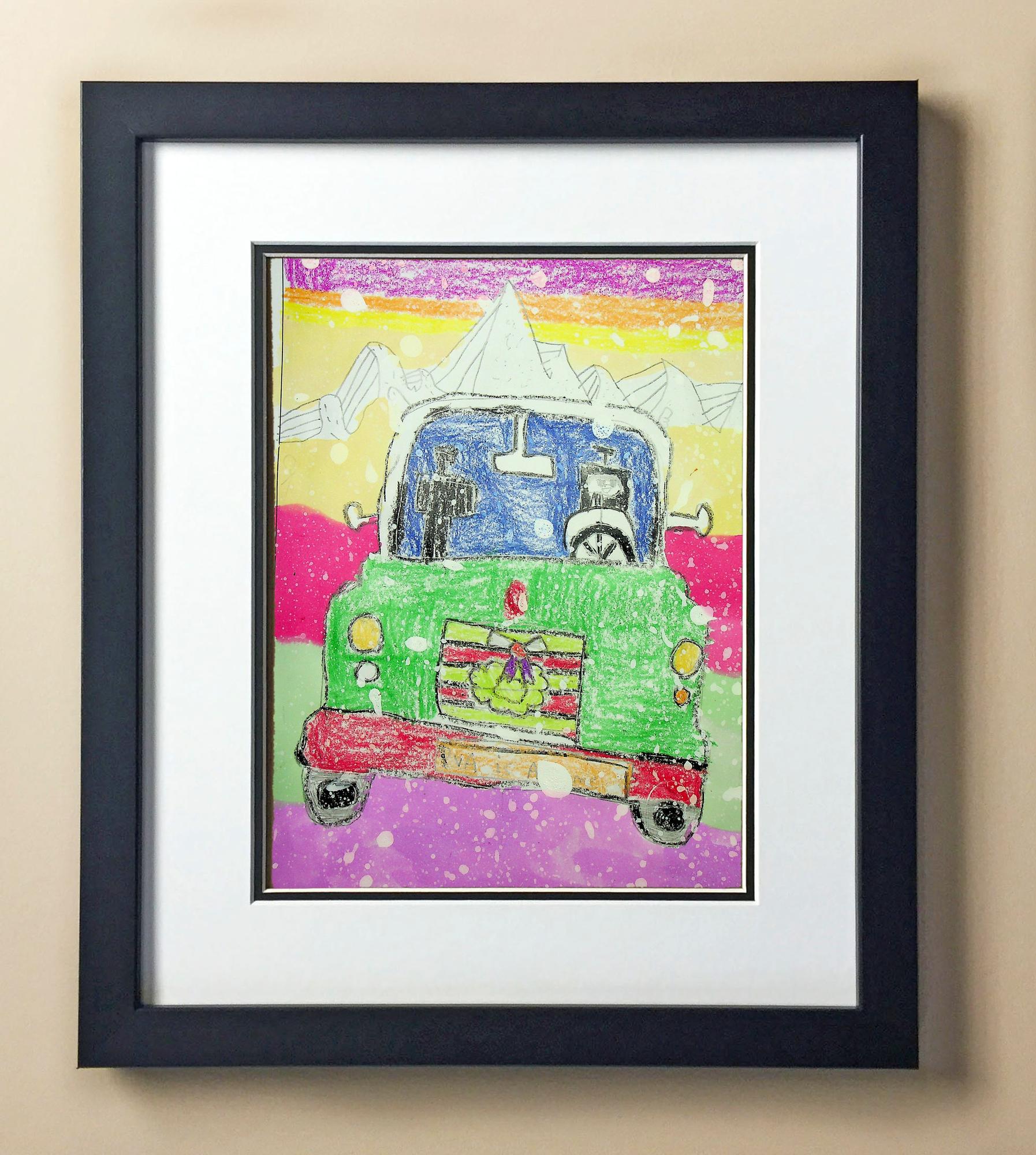 Included with the purchase is the Students Artwork, Frame, double matboard, shatter proof plexiglass, and a ready to hang backerboard with turnbuttons