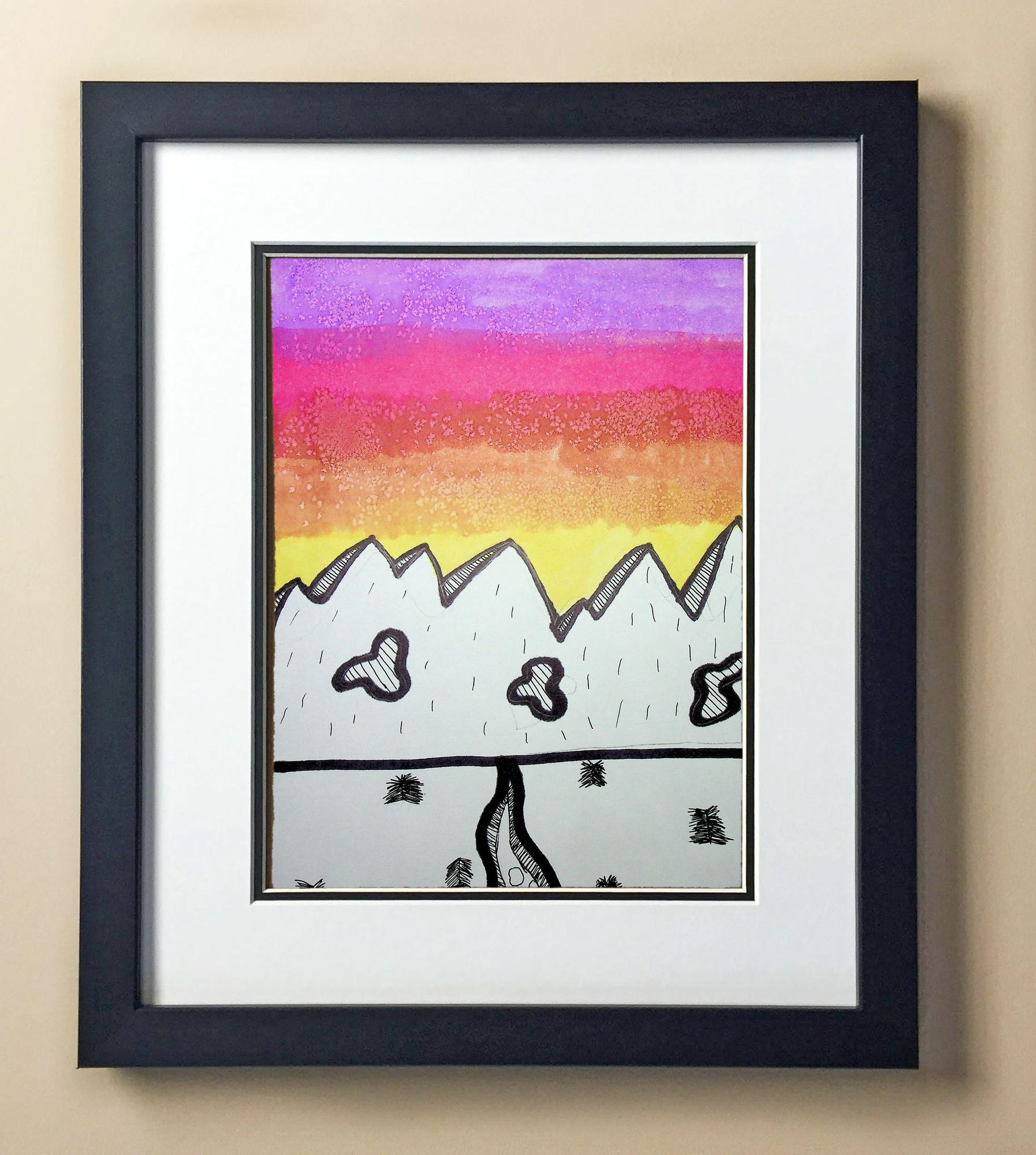 Included with the purchase is the Students Artwork, Frame, double matboard, shatter proof plexiglass, and a ready to hang backerboard with turnbuttons