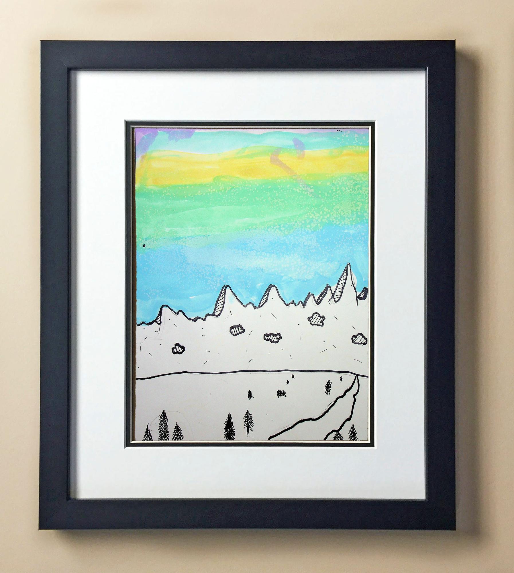 Included with the purchase is the Students Artwork, Frame, double matboard, shatter proof plexiglass, and a ready to hang backerboard with turnbuttons
