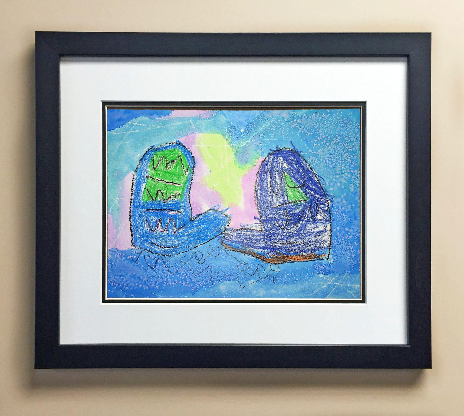 Included with the purchase is the Students Artwork, Frame, double matboard, shatter proof plexiglass, and a ready to hang backerboard with turnbuttons