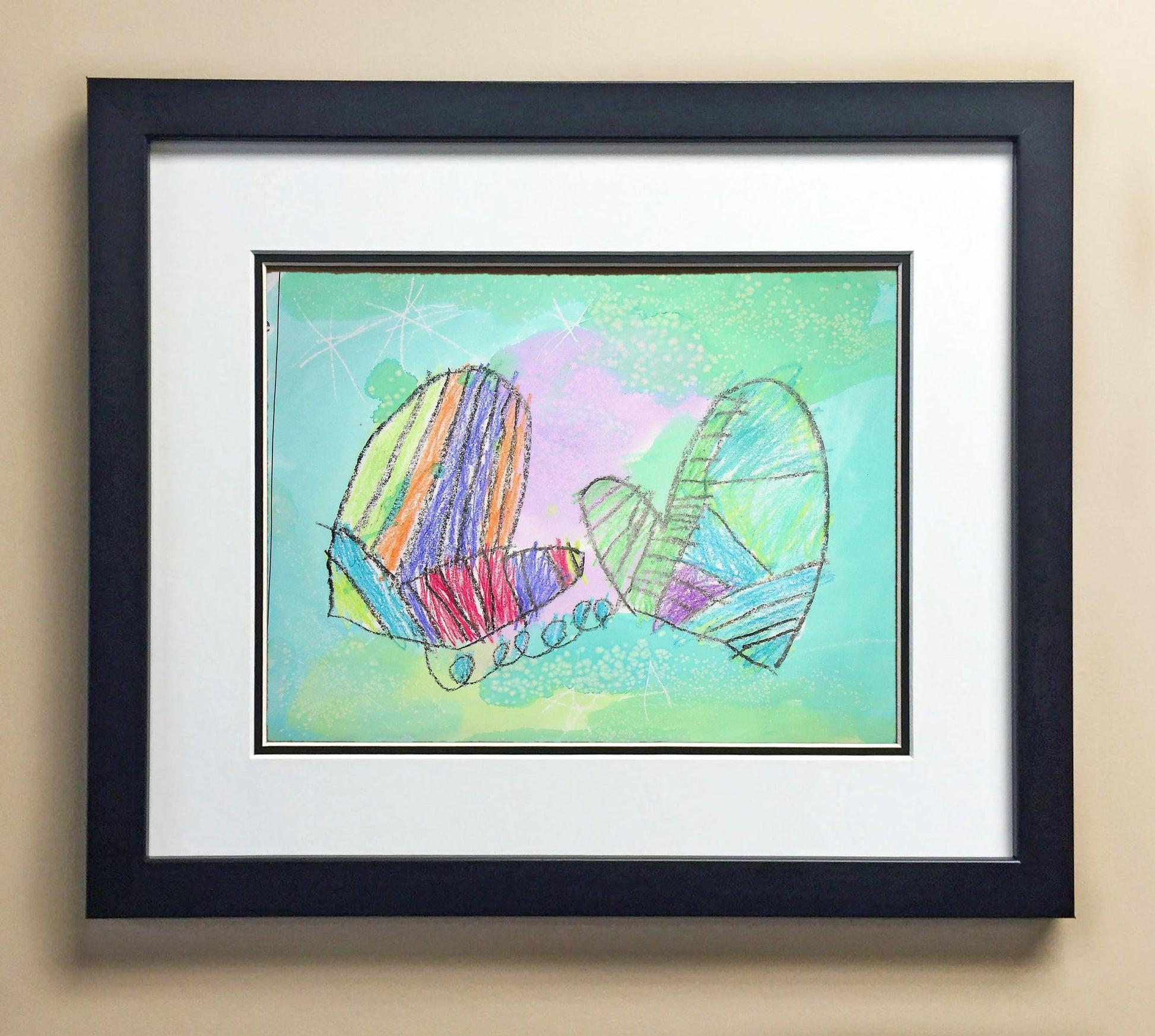 Included with the purchase is the Students Artwork, Frame, double matboard, shatter proof plexiglass, and a ready to hang backerboard with turnbuttons