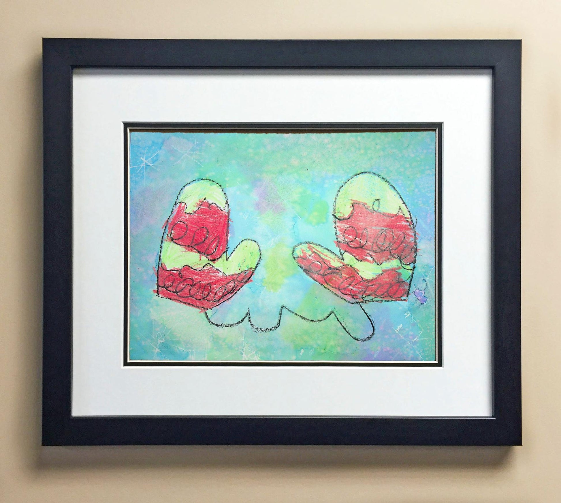 Included with the purchase is the Students Artwork, Frame, double matboard, shatter proof plexiglass, and a ready to hang backerboard with turnbuttons