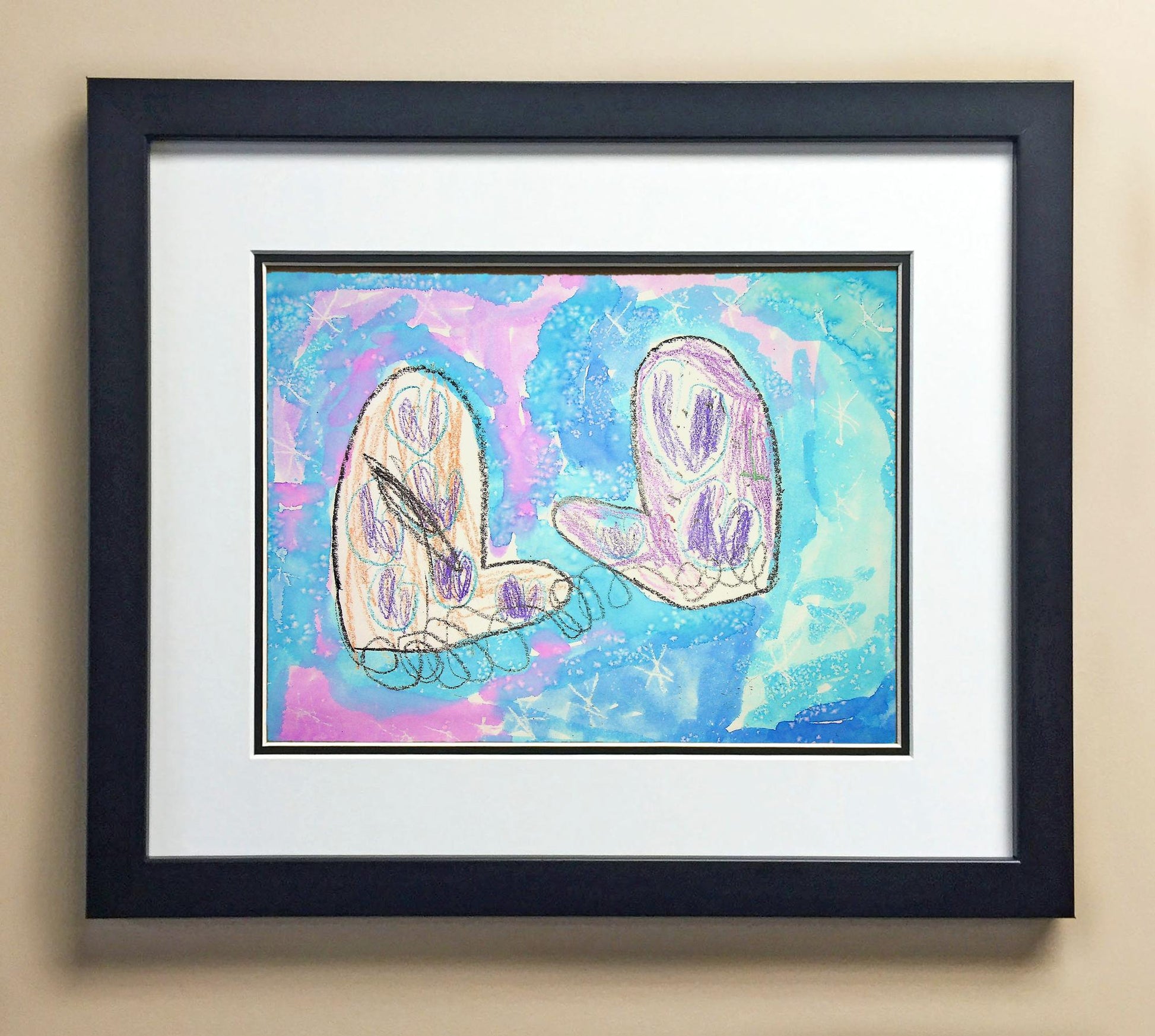 Included with the purchase is the Students Artwork, Frame, double matboard, shatter proof plexiglass, and a ready to hang backerboard with turnbuttons