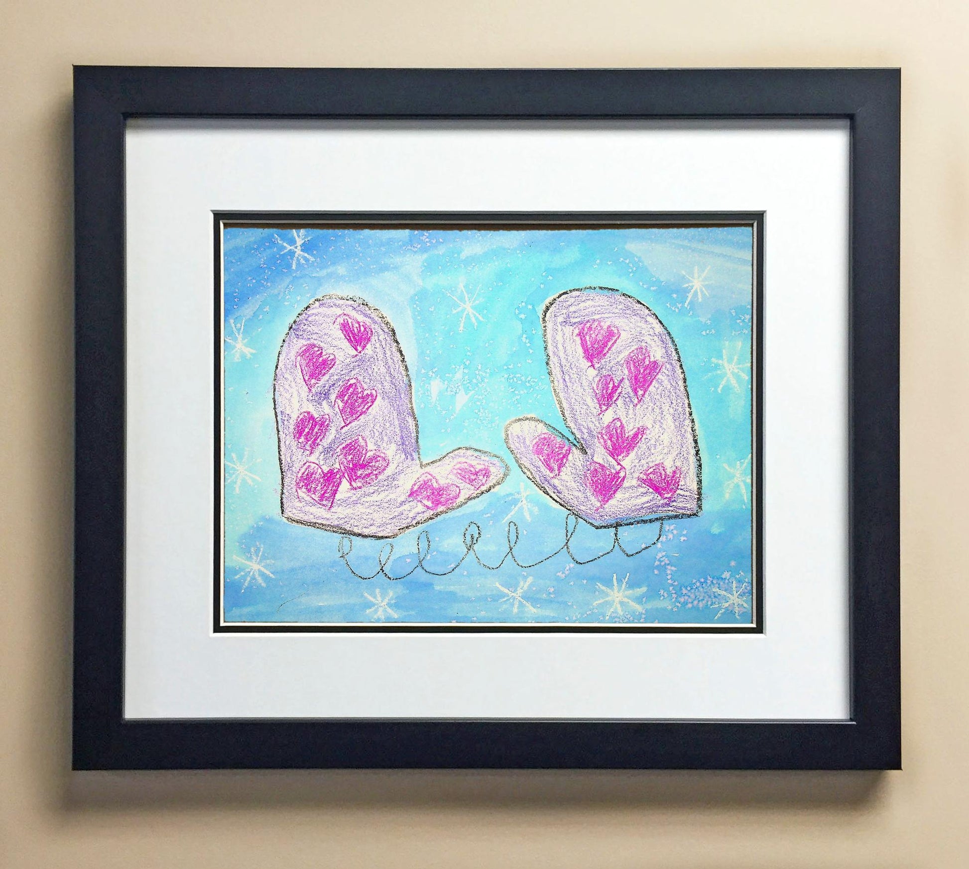 Included with the purchase is the Students Artwork, Frame, double matboard, shatter proof plexiglass, and a ready to hang backerboard with turnbuttons