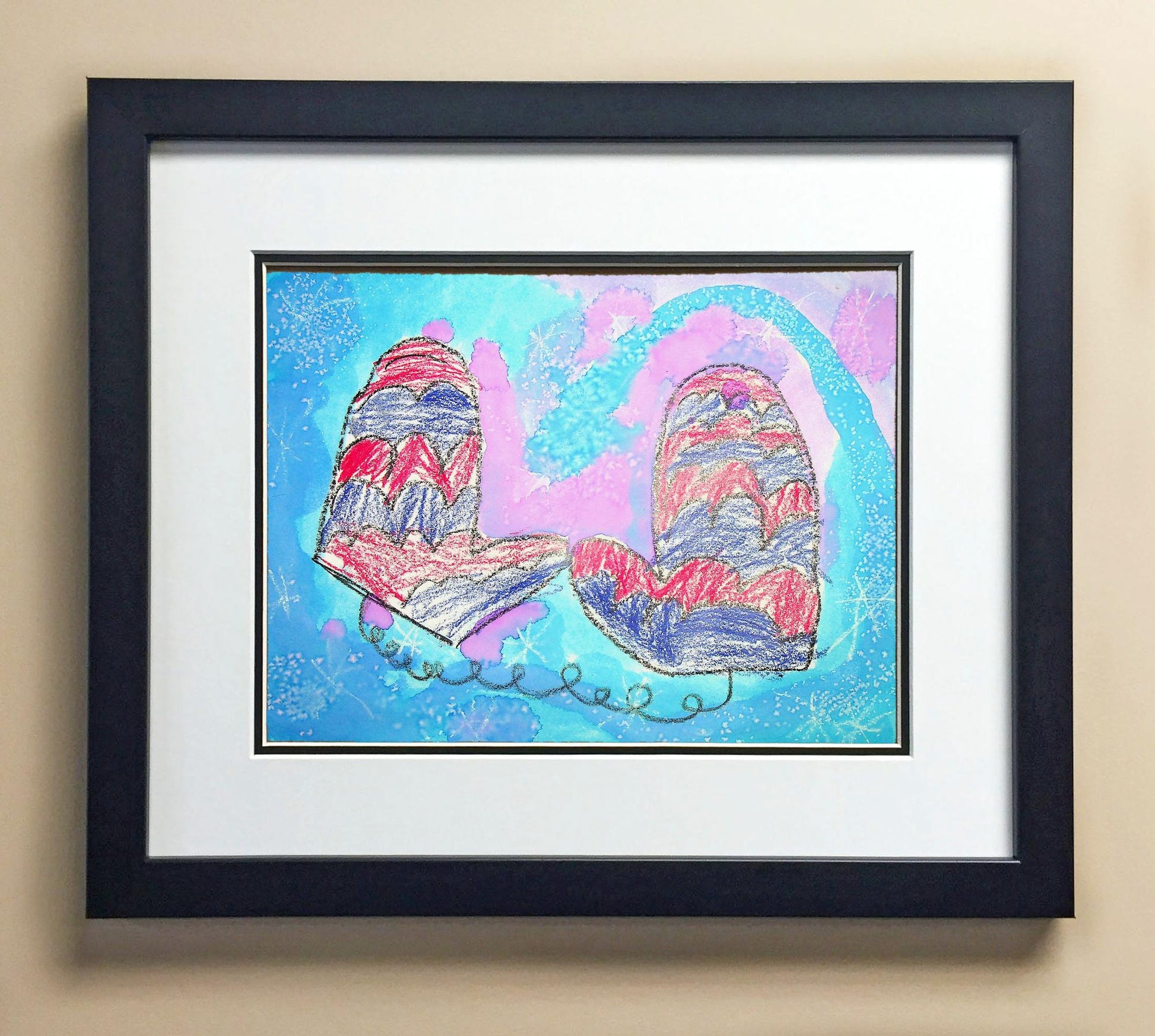 Included with the purchase is the Students Artwork, Frame, double matboard, shatter proof plexiglass, and a ready to hang backerboard with turnbuttons