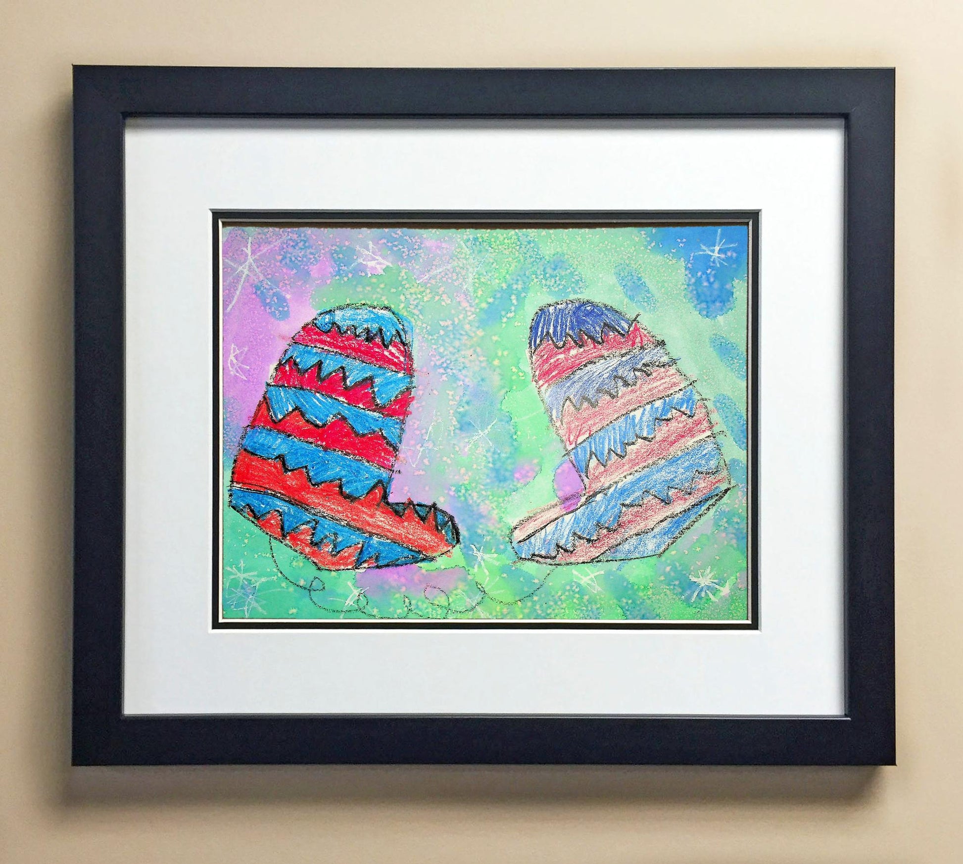 Included with the purchase is the Students Artwork, Frame, double matboard, shatter proof plexiglass, and a ready to hang backerboard with turnbuttons