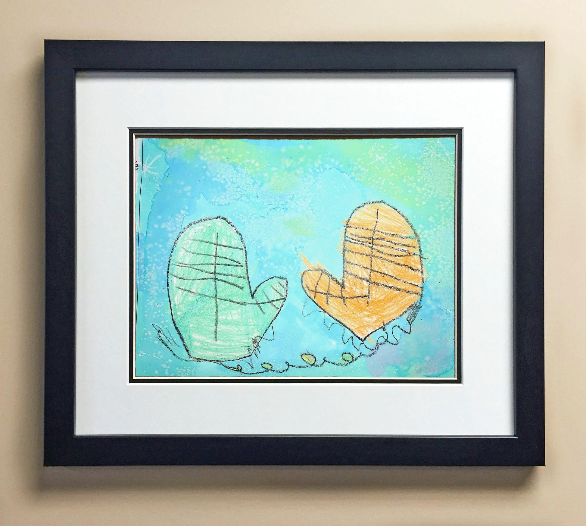 Included with the purchase is the Students Artwork, Frame, double matboard, shatter proof plexiglass, and a ready to hang backerboard with turnbuttons