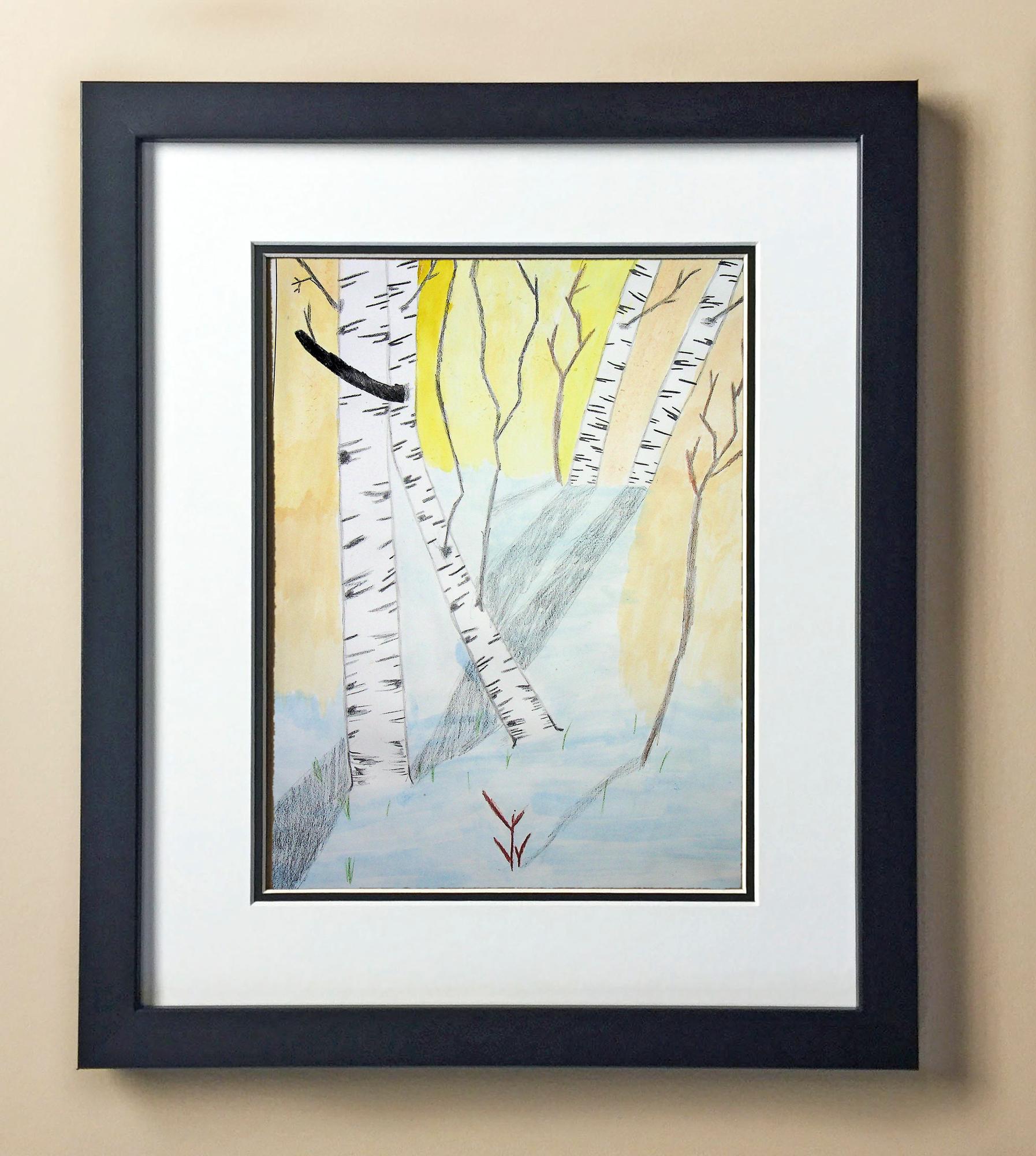 Included with the purchase is the Students Artwork, Frame, double matboard, shatter proof plexiglass, and a ready to hang backerboard with turnbuttons