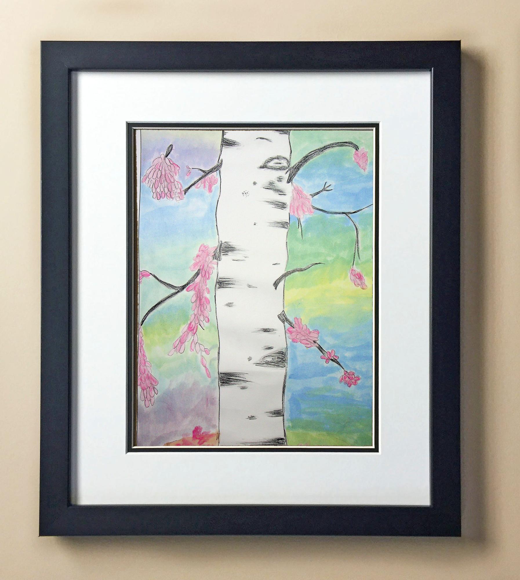 Included with the purchase is the Students Artwork, Frame, double matboard, shatter proof plexiglass, and a ready to hang backerboard with turnbuttons