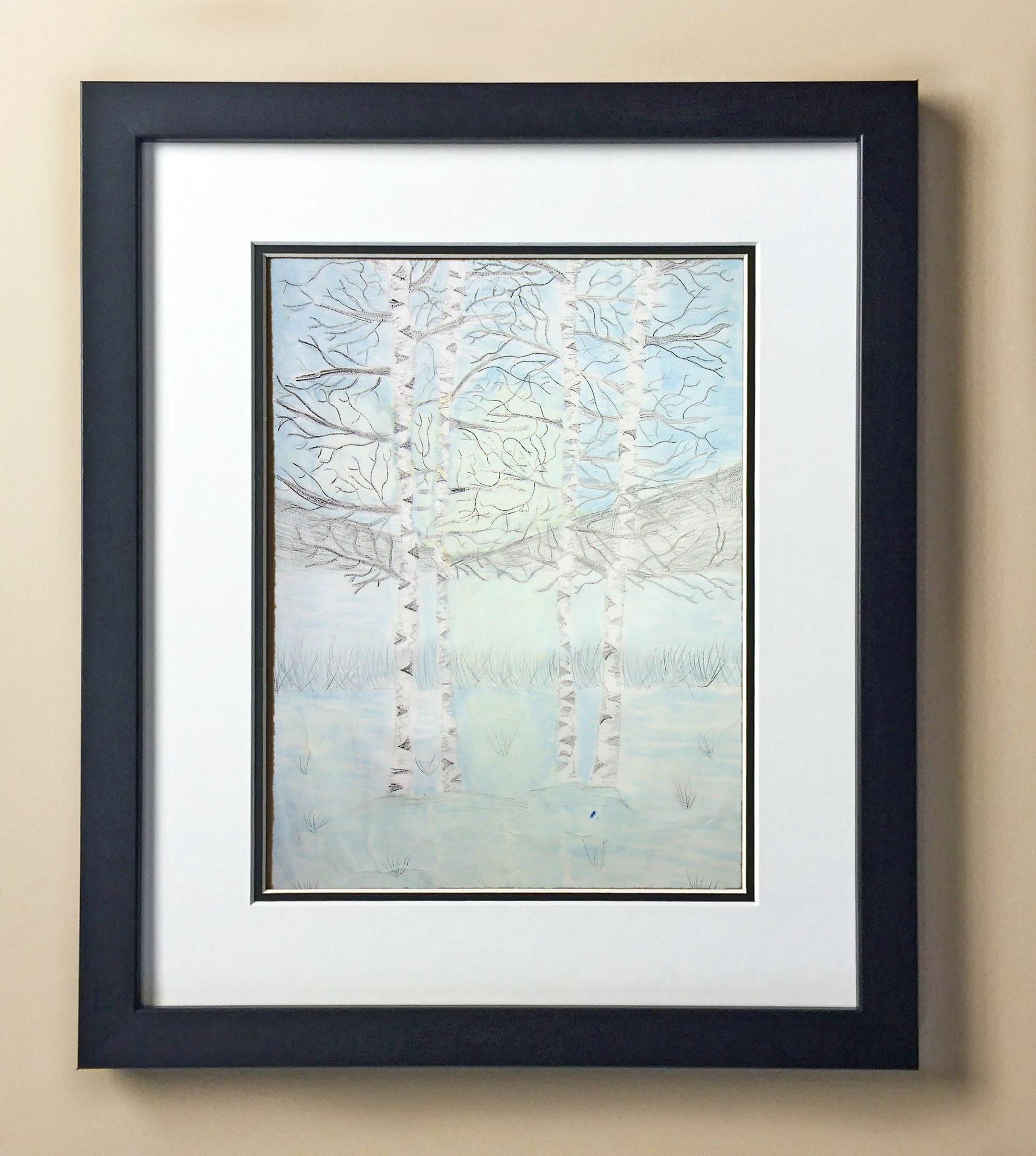 Included with the purchase is the Students Artwork, Frame, double matboard, shatter proof plexiglass, and a ready to hang backerboard with turnbuttons