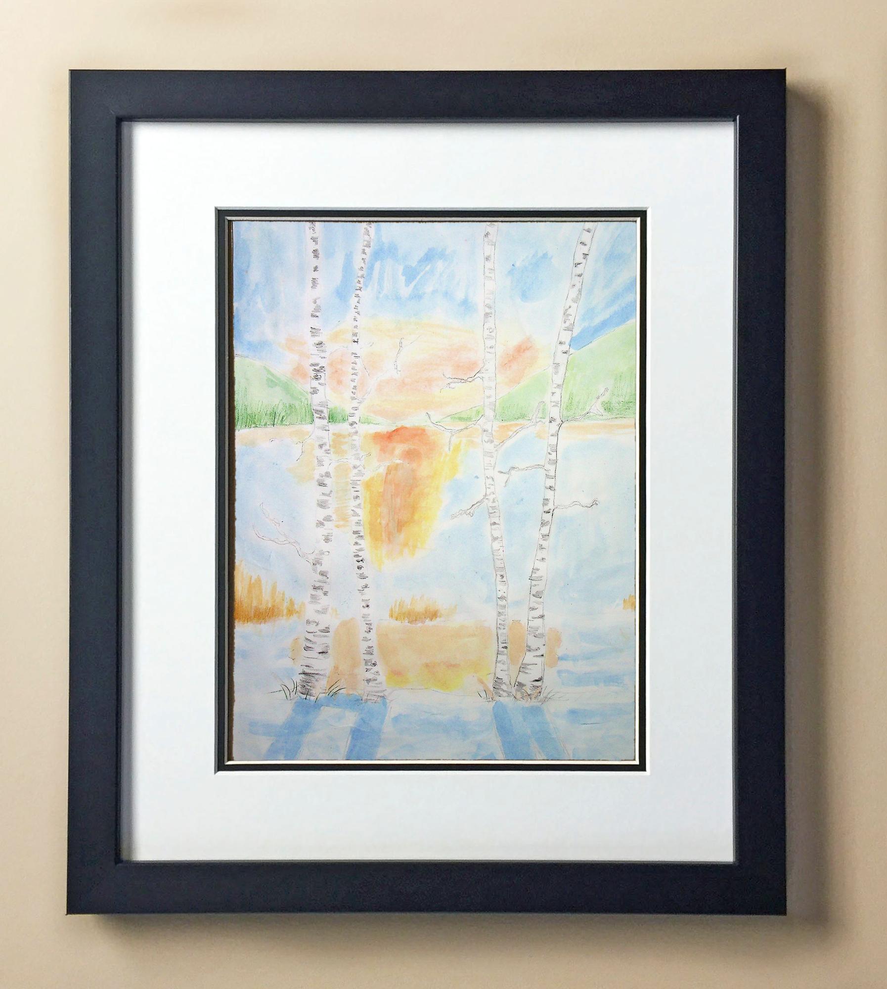 Included with the purchase is the Students Artwork, Frame, double matboard, shatter proof plexiglass, and a ready to hang backerboard with turnbuttons