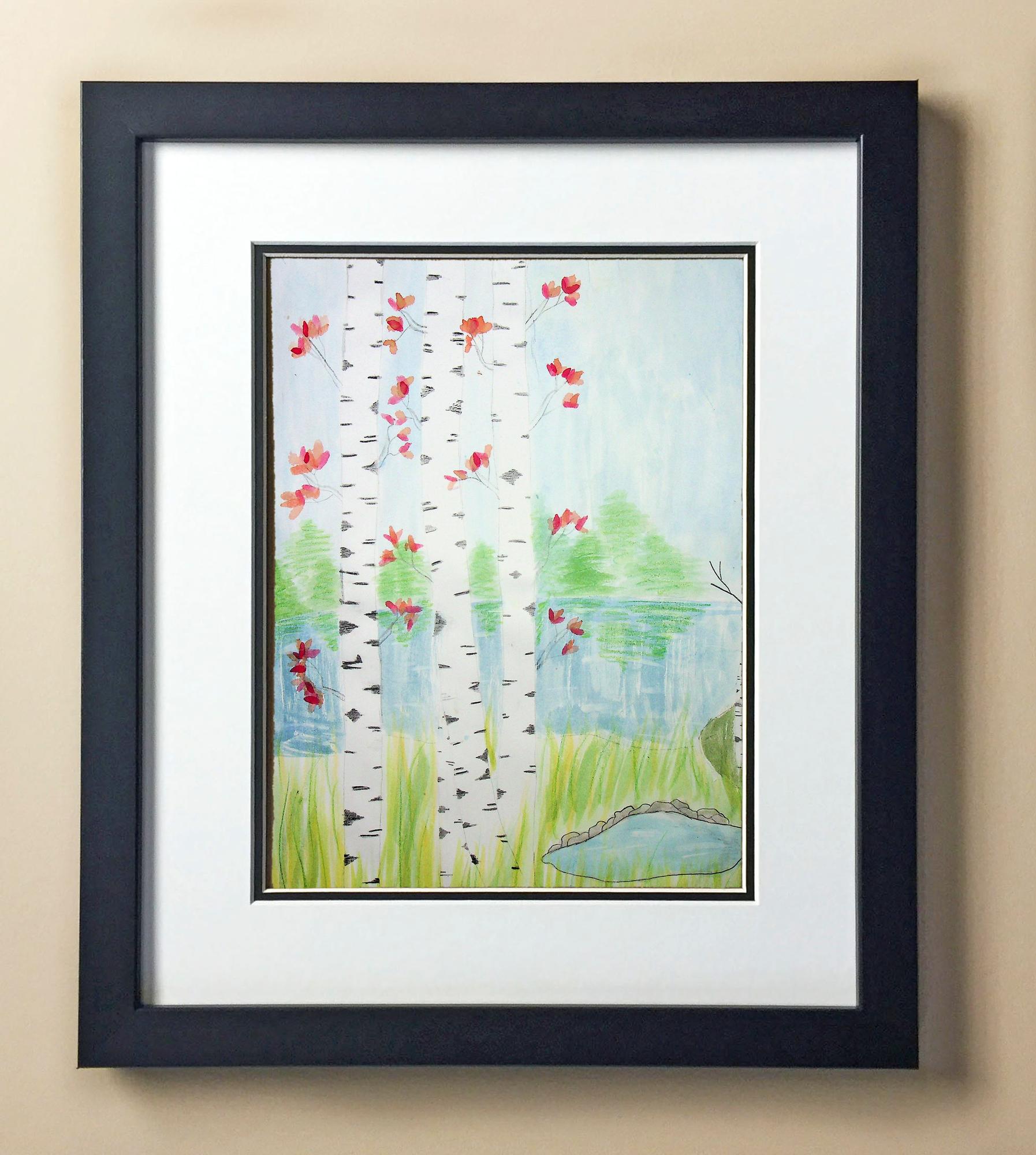 Included with the purchase is the Students Artwork, Frame, double matboard, shatter proof plexiglass, and a ready to hang backerboard with turnbuttons
