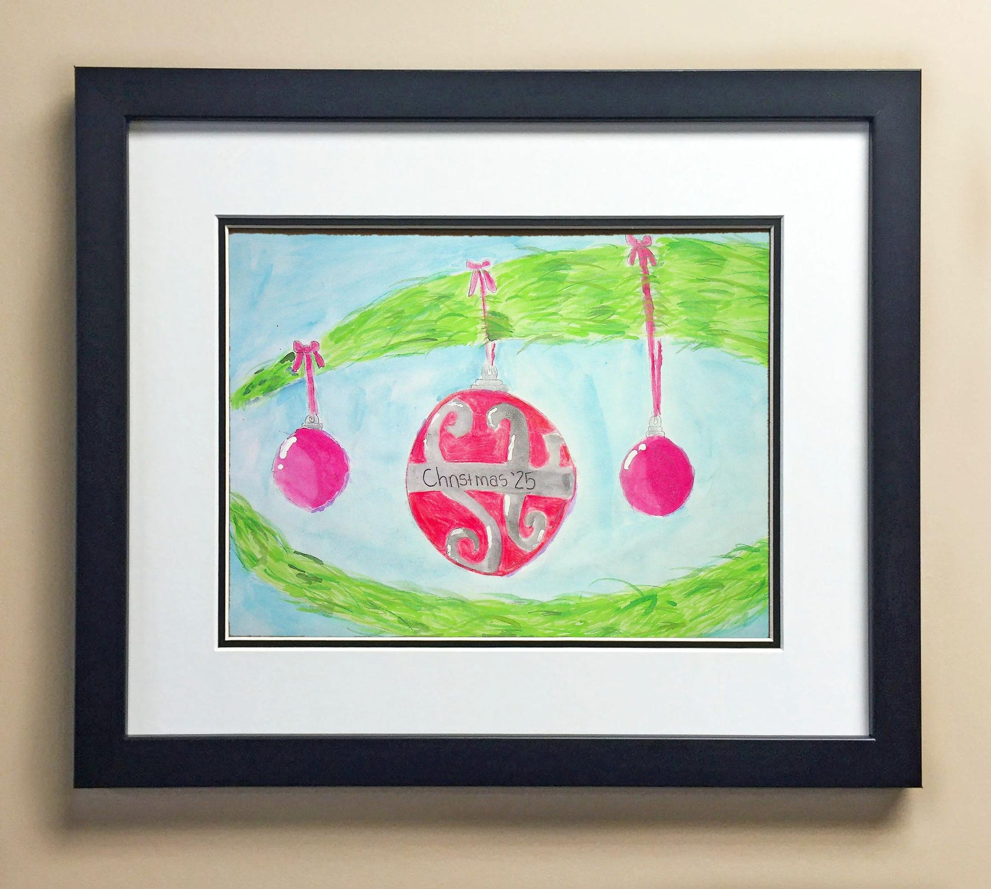 Included with the purchase is the Students Artwork, Frame, double matboard, shatter proof plexiglass, and a ready to hang backerboard with turnbuttons