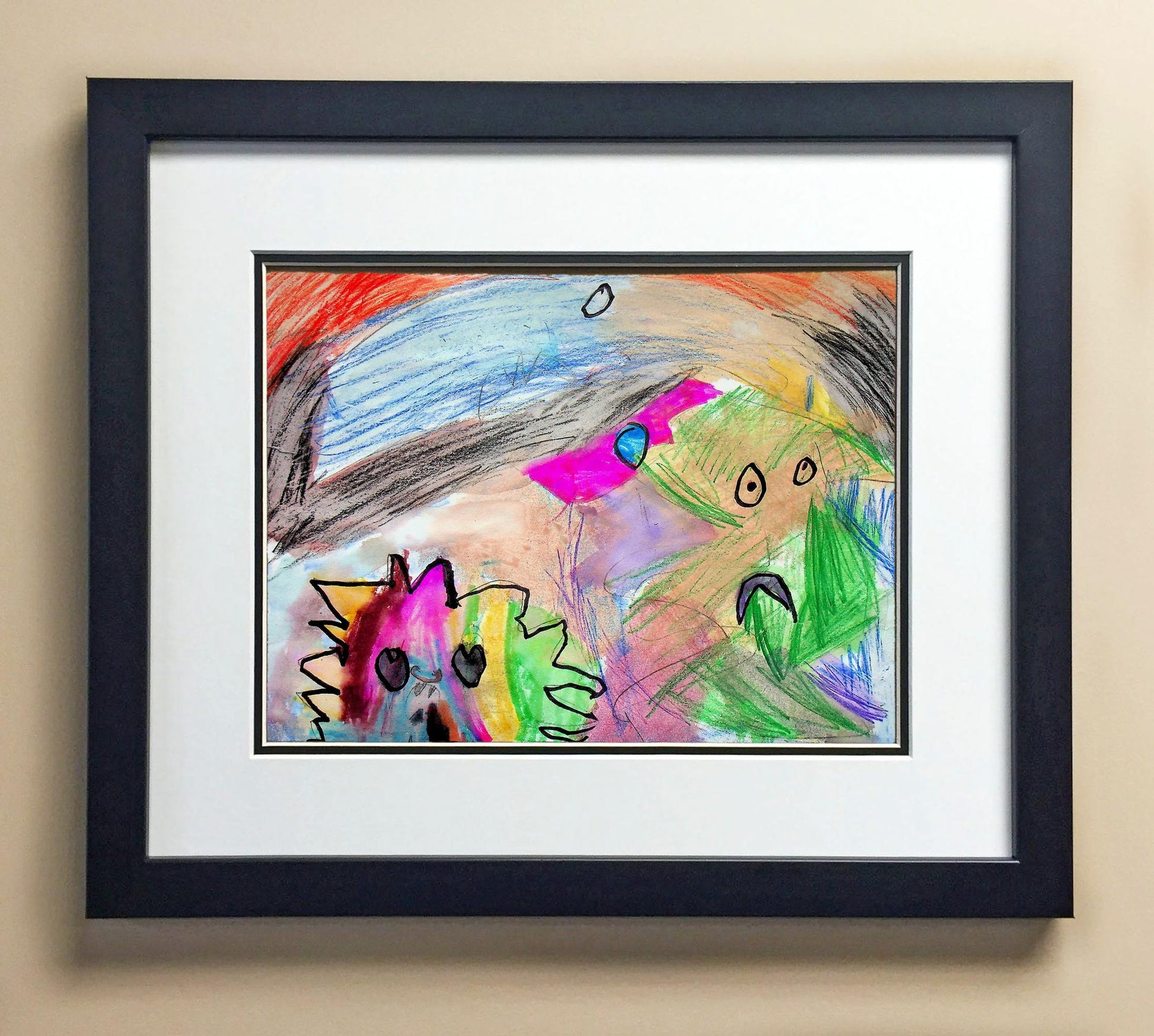 Included with the purchase is the Students Artwork, Frame, double matboard, shatter proof plexiglass, and a ready to hang backerboard with turnbuttons