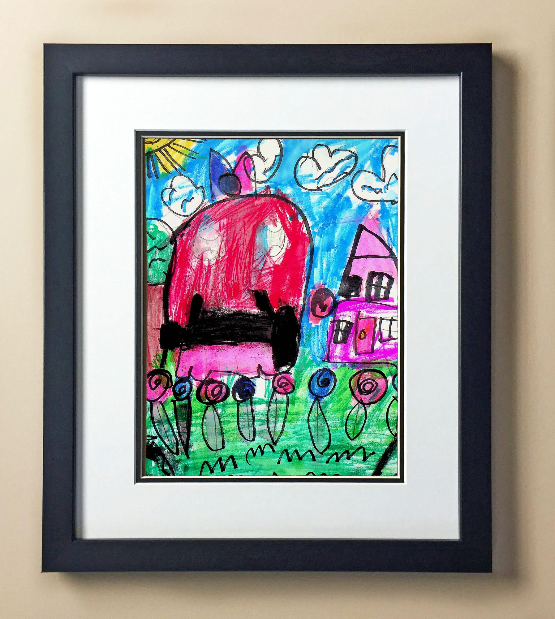 Included with the purchase is the Students Artwork, Frame, double matboard, shatter proof plexiglass, and a ready to hang backerboard with turnbuttons