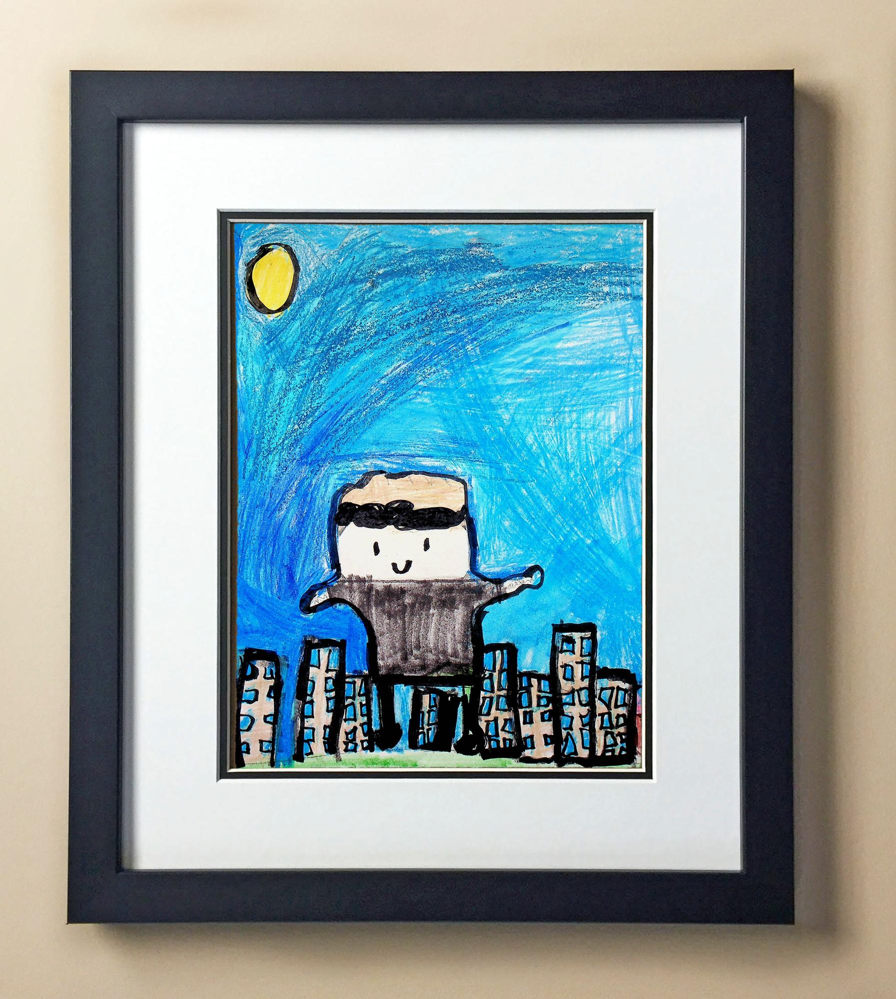 Included with the purchase is the Students Artwork, Frame, double matboard, shatter proof plexiglass, and a ready to hang backerboard with turnbuttons
