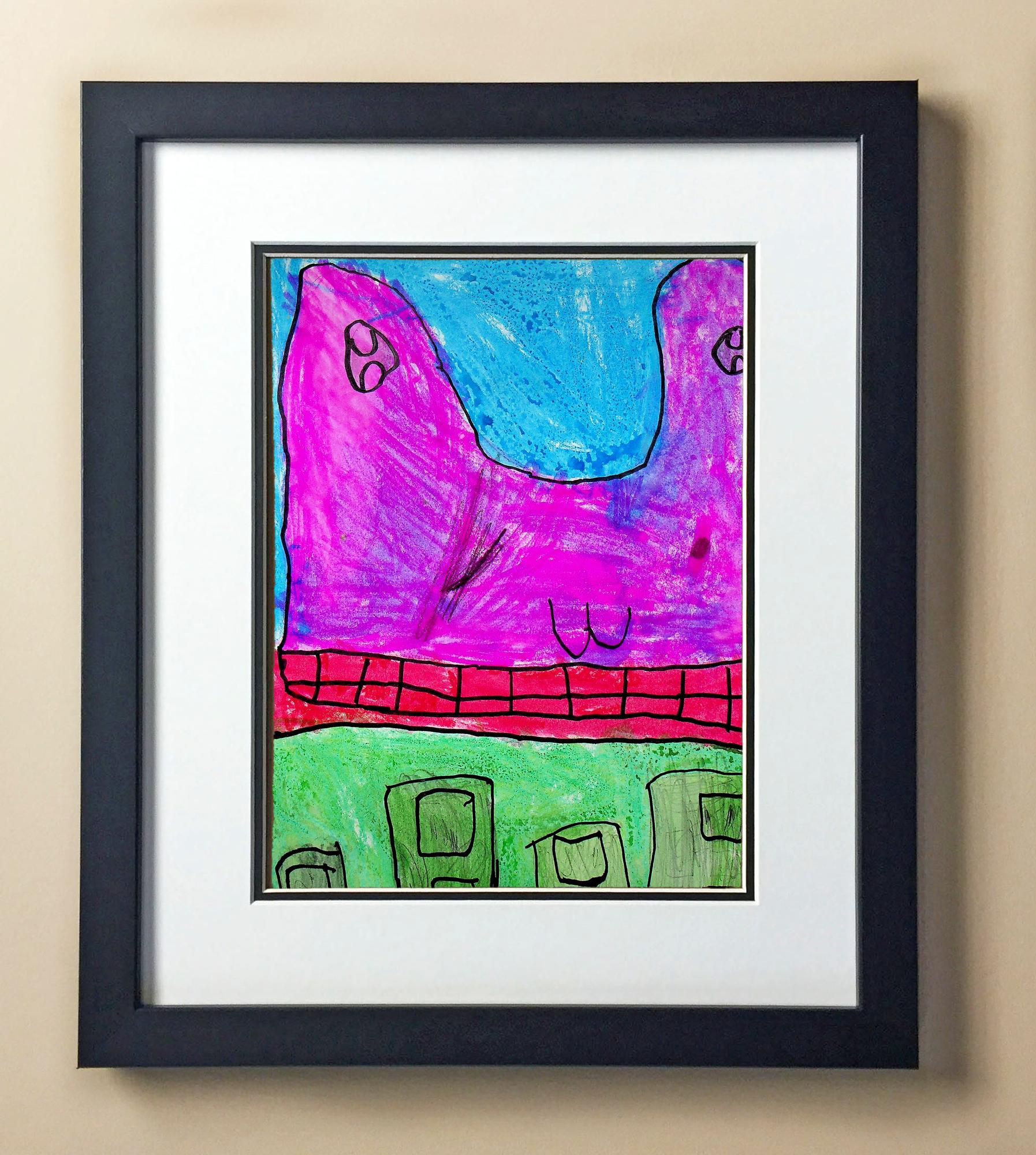 Included with the purchase is the Students Artwork, Frame, double matboard, shatter proof plexiglass, and a ready to hang backerboard with turnbuttons