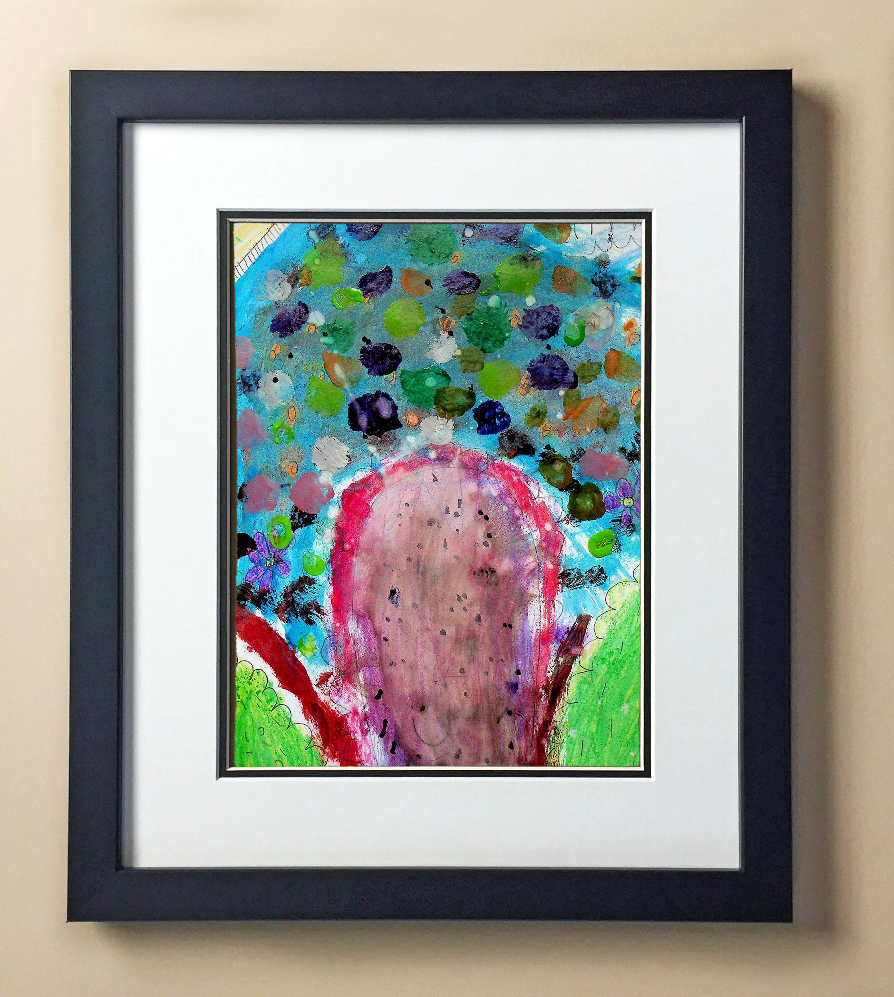 Included with the purchase is the Students Artwork, Frame, double matboard, shatter proof plexiglass, and a ready to hang backerboard with turnbuttons