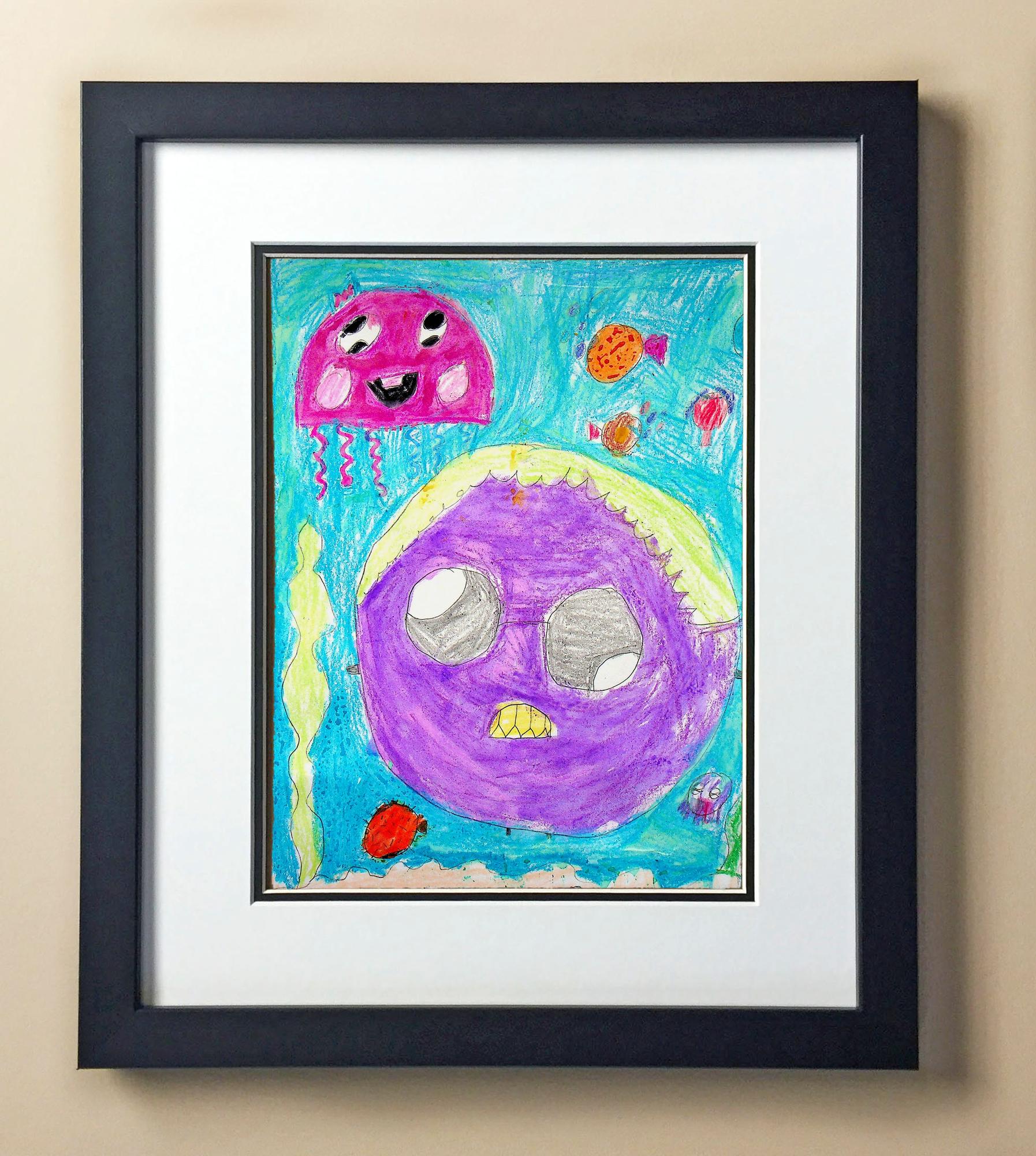 Included with the purchase is the Students Artwork, Frame, double matboard, shatter proof plexiglass, and a ready to hang backerboard with turnbuttons
