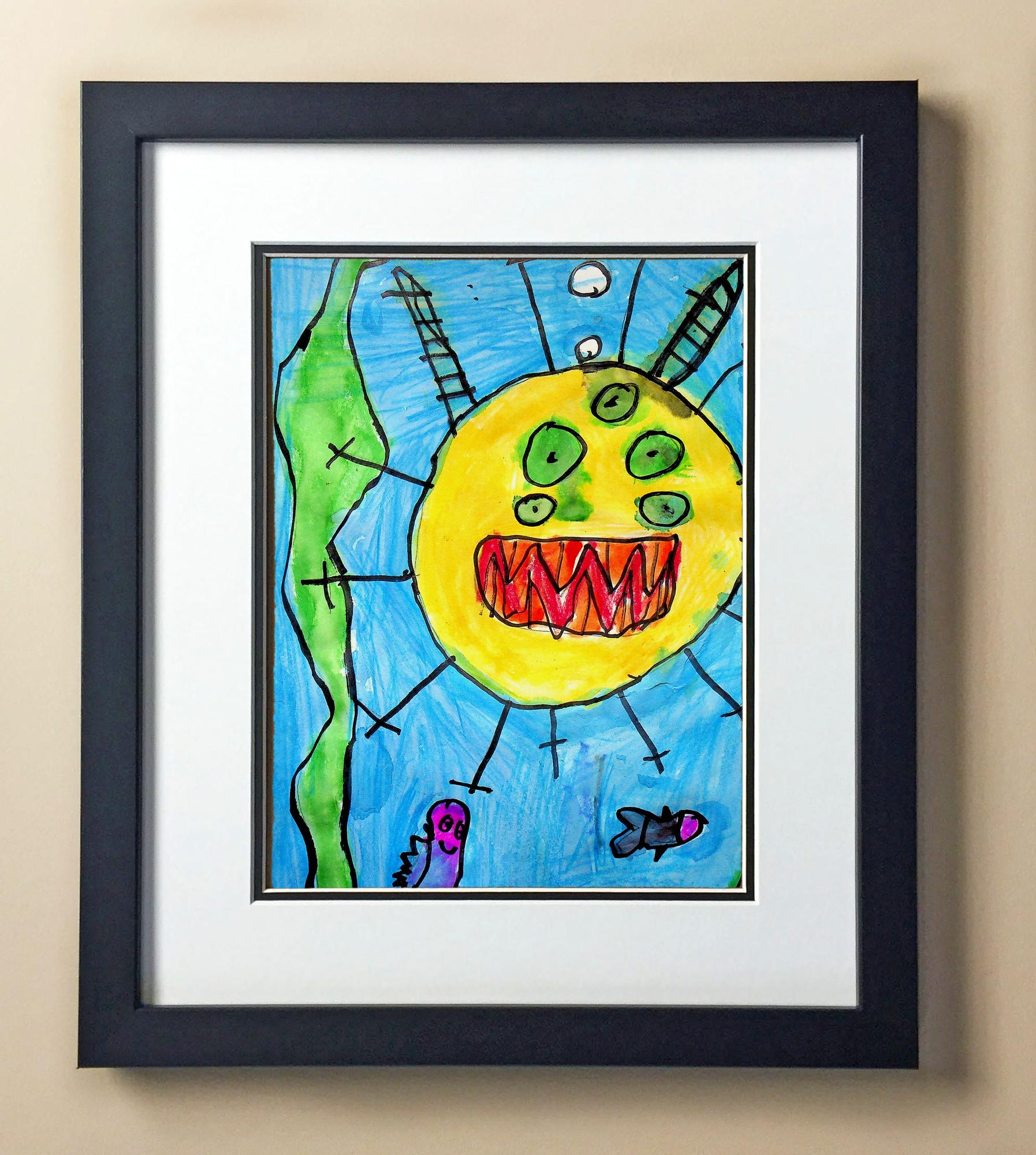 Included with the purchase is the Students Artwork, Frame, double matboard, shatter proof plexiglass, and a ready to hang backerboard with turnbuttons