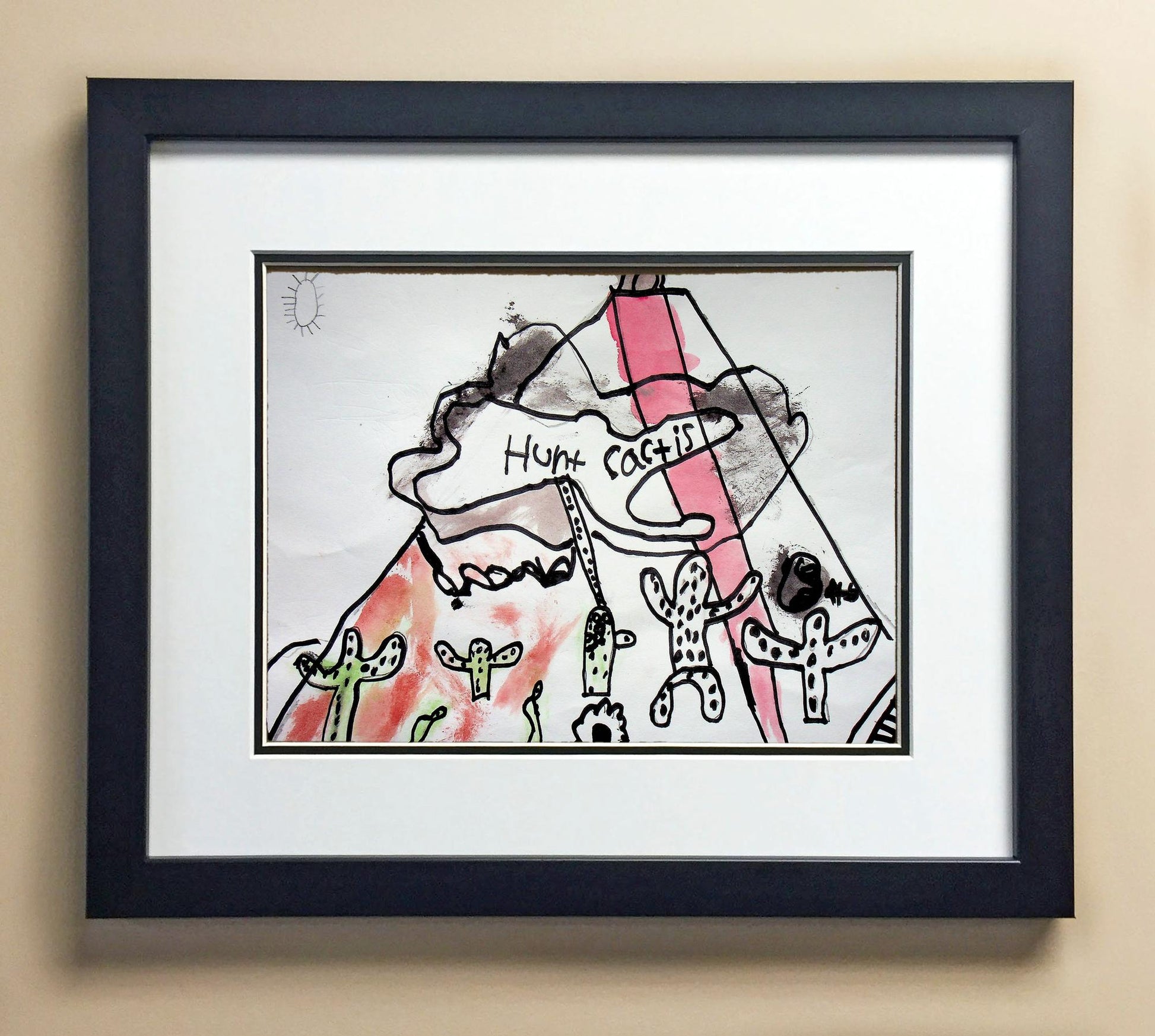 Included with the purchase is the Students Artwork, Frame, double matboard, shatter proof plexiglass, and a ready to hang backerboard with turnbuttons