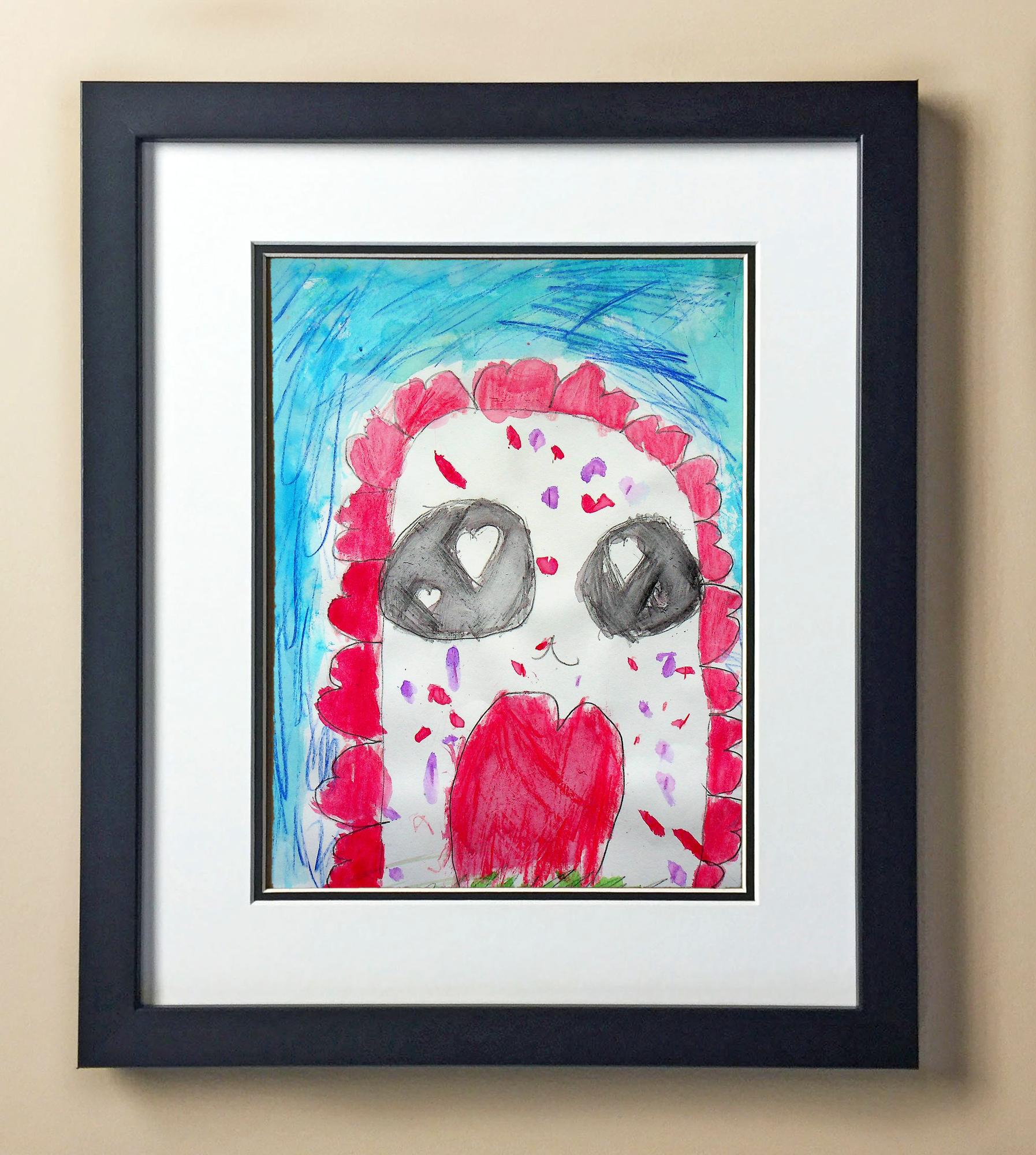 Included with the purchase is the Students Artwork, Frame, double matboard, shatter proof plexiglass, and a ready to hang backerboard with turnbuttons