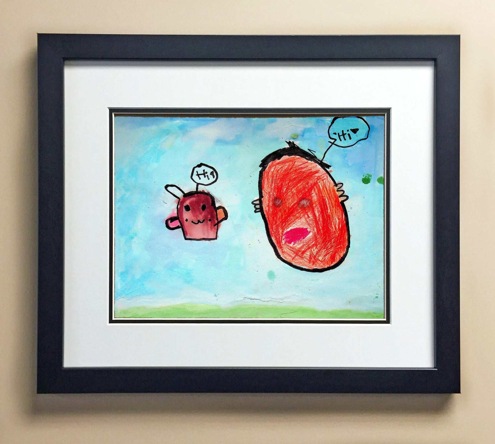 Included with the purchase is the Students Artwork, Frame, double matboard, shatter proof plexiglass, and a ready to hang backerboard with turnbuttons