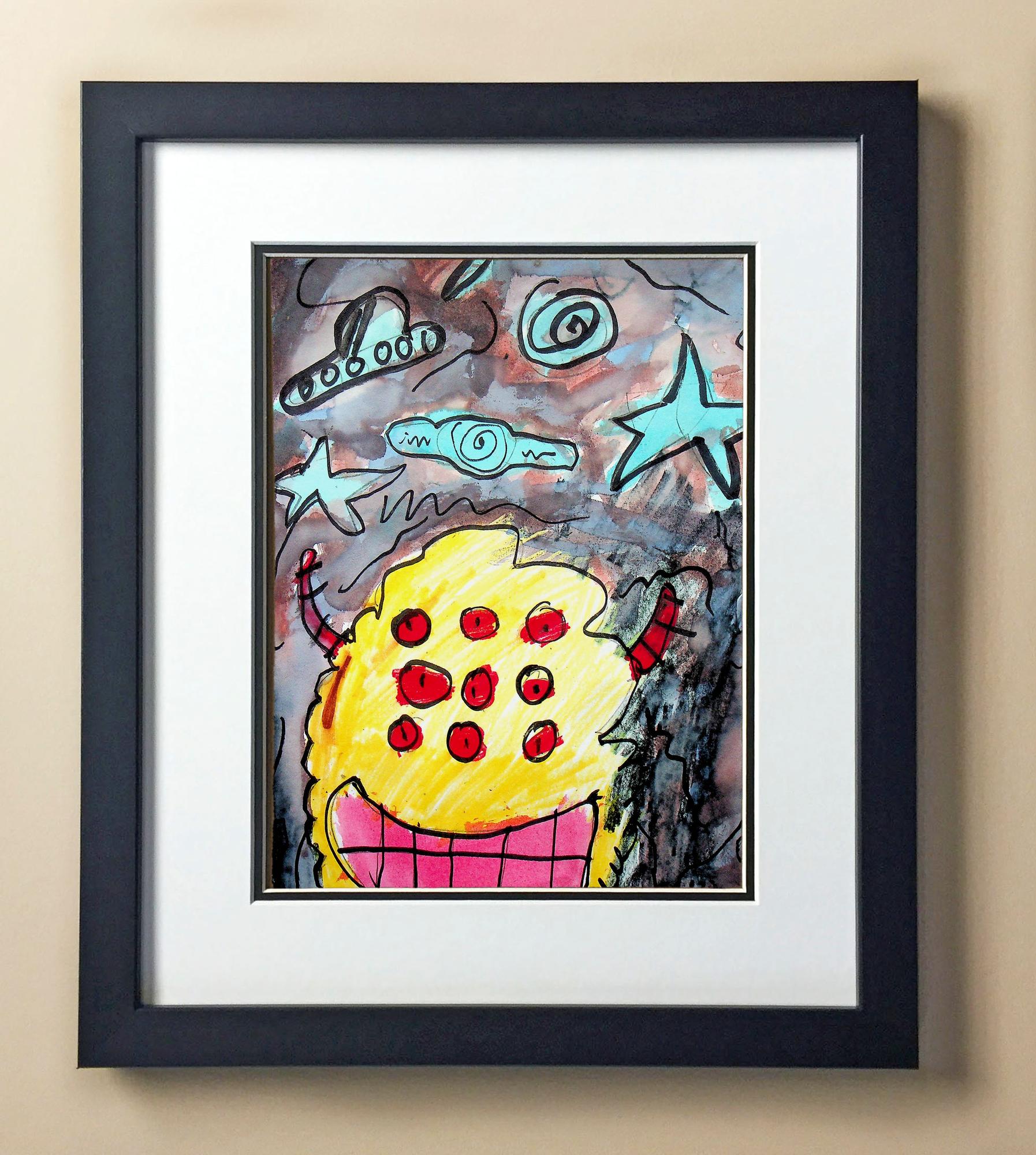Included with the purchase is the Students Artwork, Frame, double matboard, shatter proof plexiglass, and a ready to hang backerboard with turnbuttons
