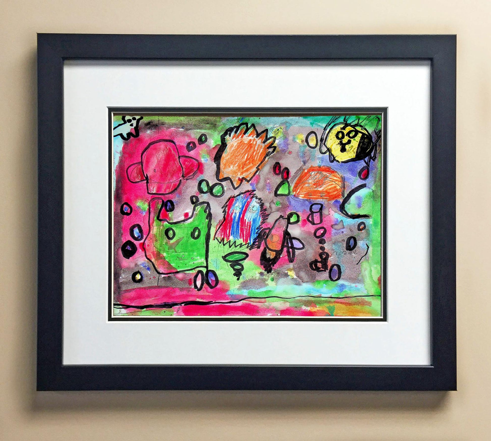 Included with the purchase is the Students Artwork, Frame, double matboard, shatter proof plexiglass, and a ready to hang backerboard with turnbuttons