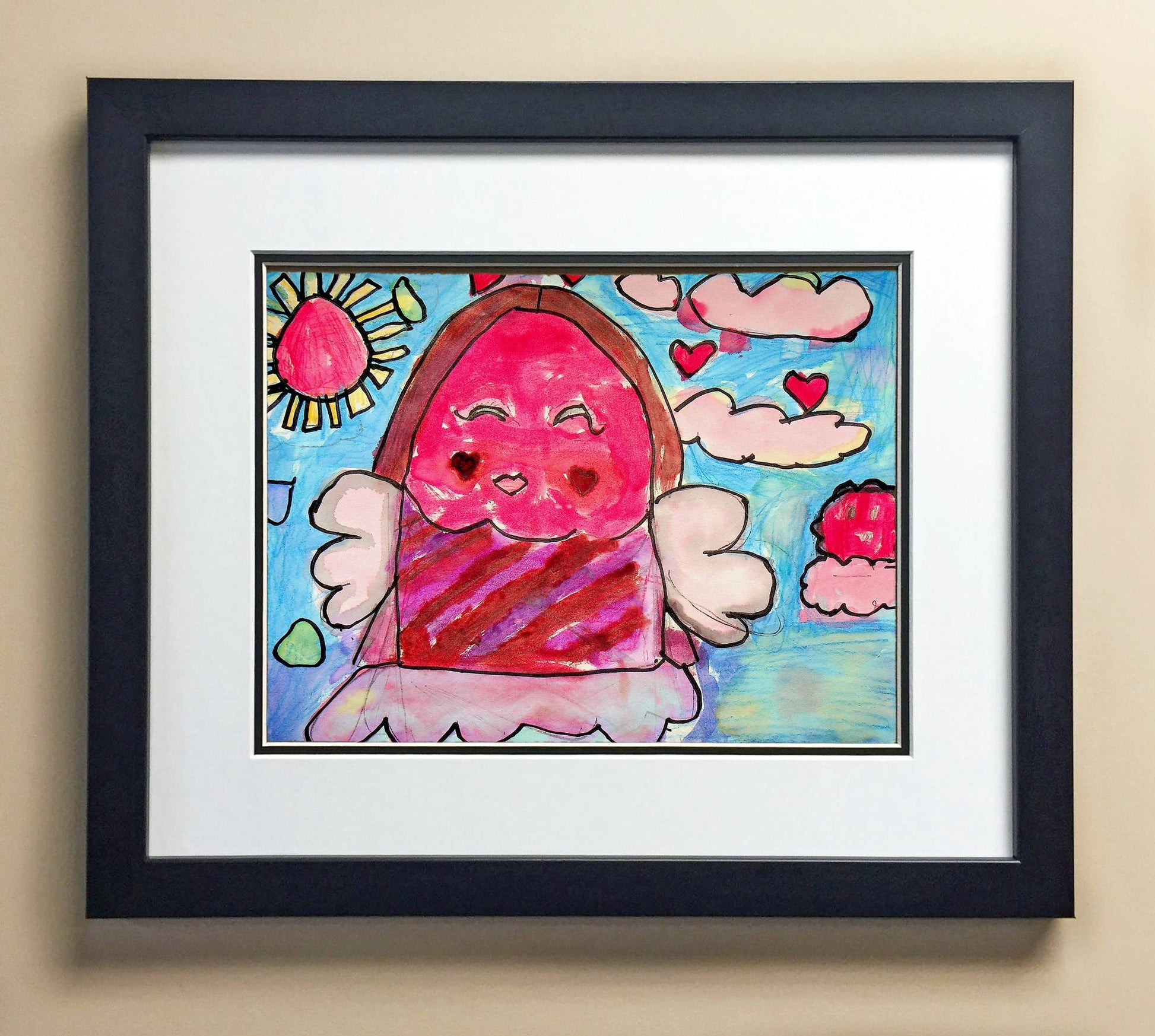 Included with the purchase is the Students Artwork, Frame, double matboard, shatter proof plexiglass, and a ready to hang backerboard with turnbuttons