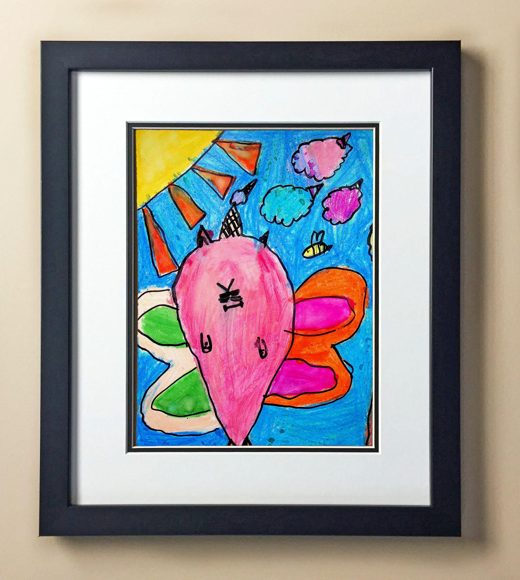 Included with the purchase is the Students Artwork, Frame, double matboard, shatter proof plexiglass, and a ready to hang backerboard with turnbuttons