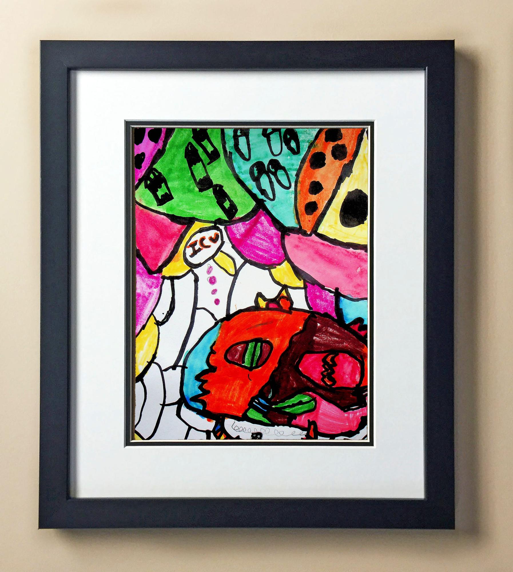 Included with the purchase is the Students Artwork, Frame, double matboard, shatter proof plexiglass, and a ready to hang backerboard with turnbuttons