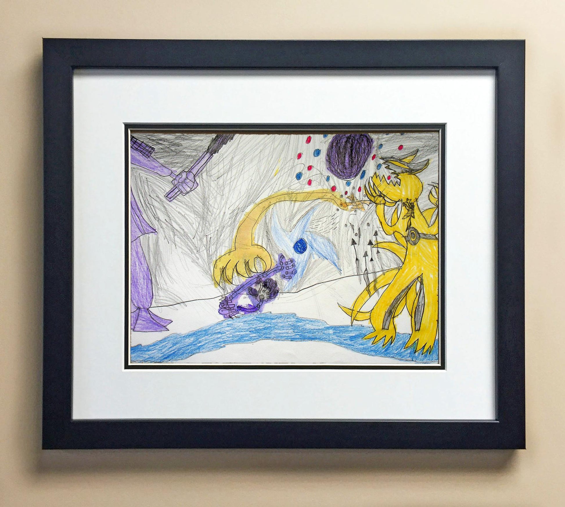 Included with the purchase is the Students Artwork, Frame, double matboard, shatter proof plexiglass, and a ready to hang backerboard with turnbuttons