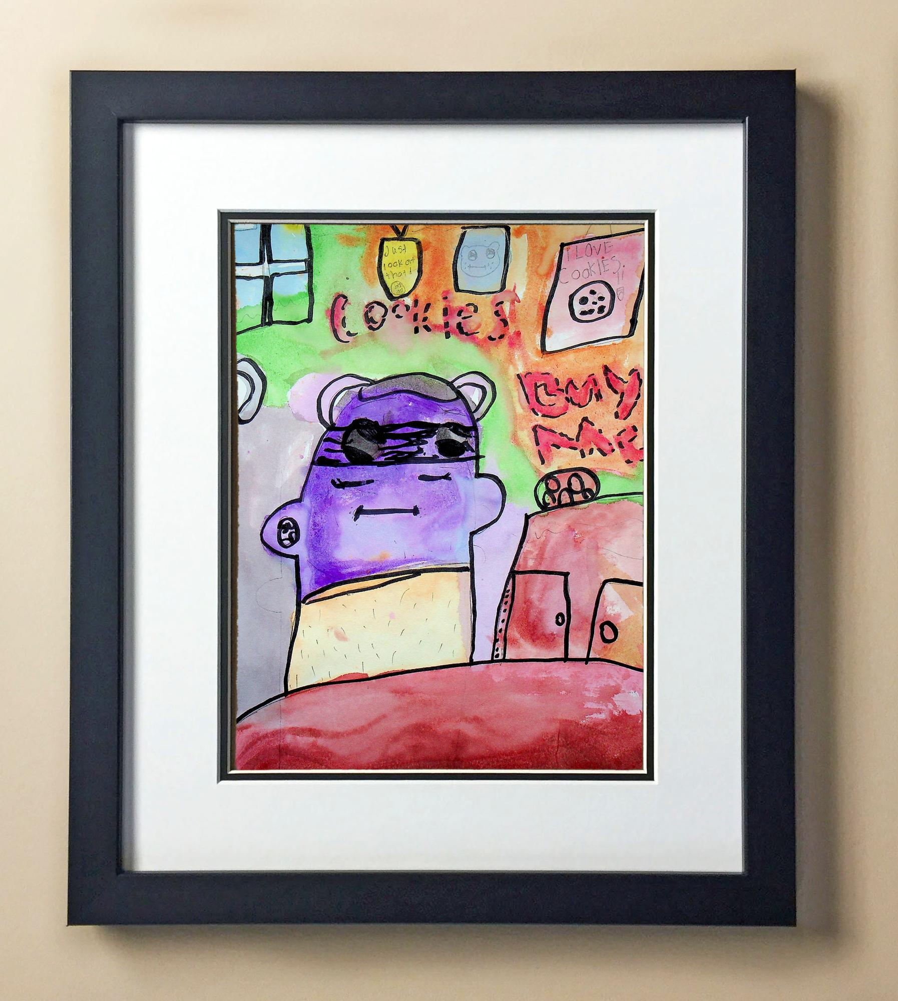 Included with the purchase is the Students Artwork, Frame, double matboard, shatter proof plexiglass, and a ready to hang backerboard with turnbuttons
