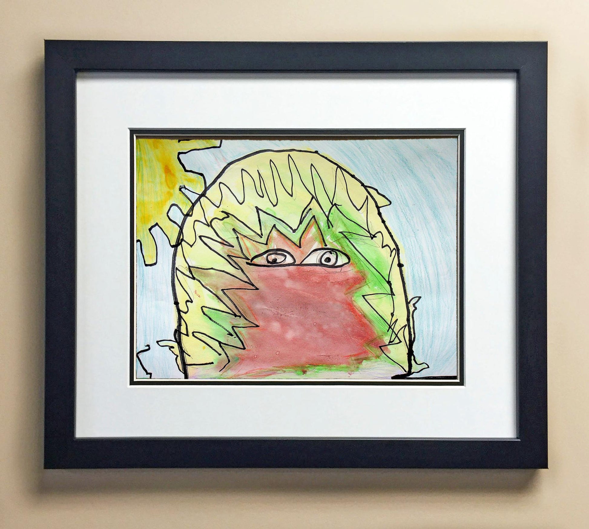 Included with the purchase is the Students Artwork, Frame, double matboard, shatter proof plexiglass, and a ready to hang backerboard with turnbuttons