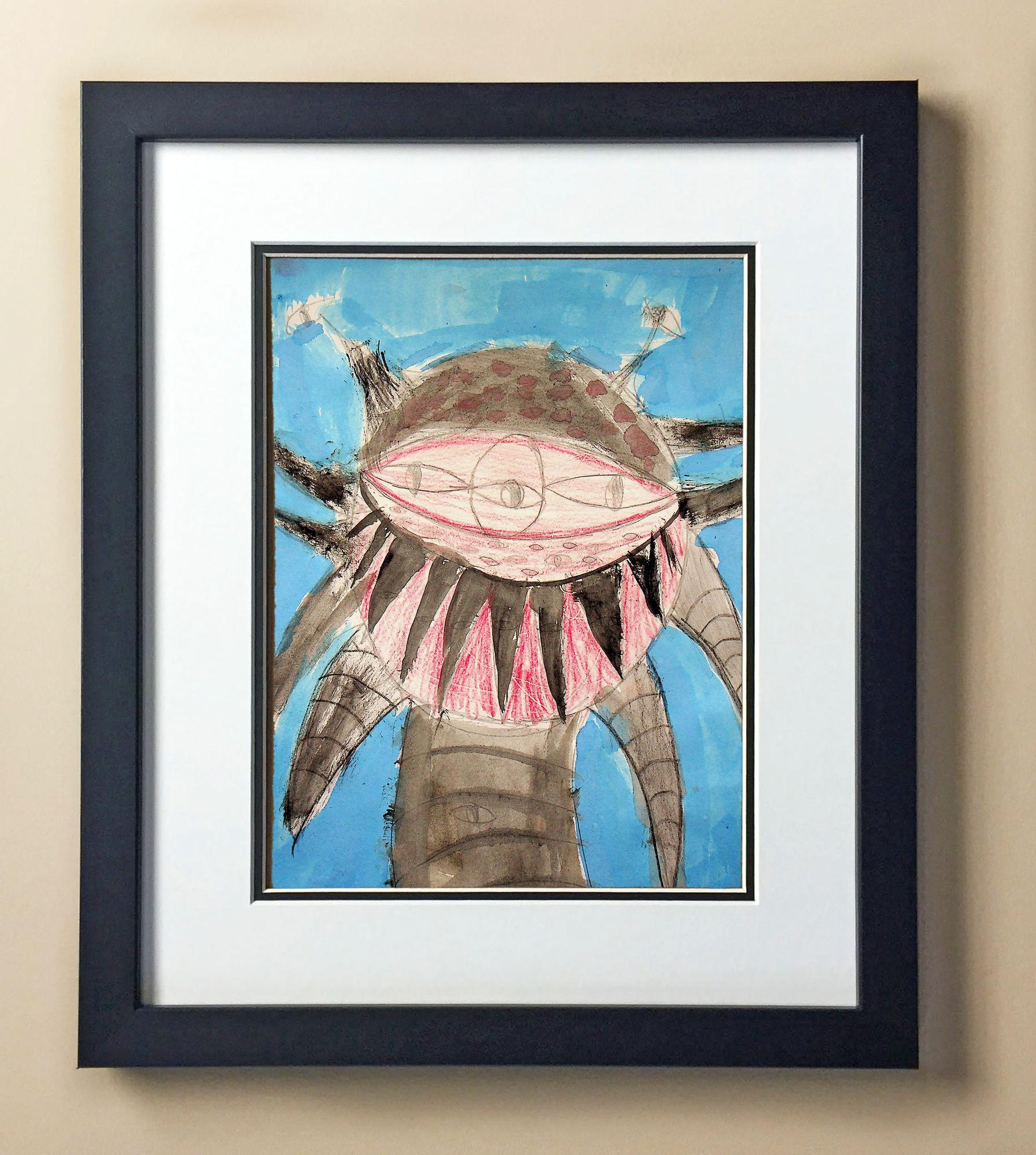 Included with the purchase is the Students Artwork, Frame, double matboard, shatter proof plexiglass, and a ready to hang backerboard with turnbuttons