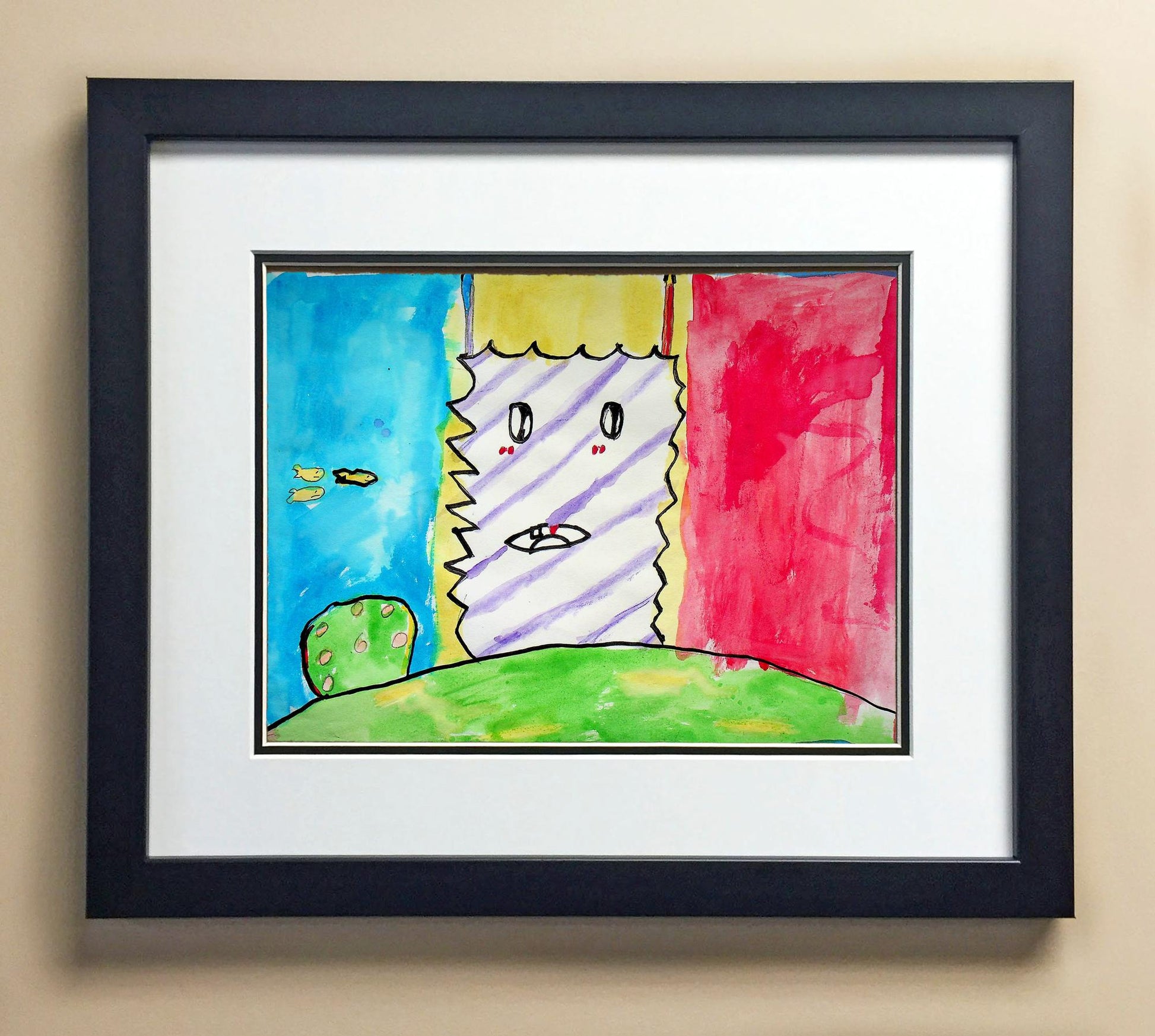 Included with the purchase is the Students Artwork, Frame, double matboard, shatter proof plexiglass, and a ready to hang backerboard with turnbuttons