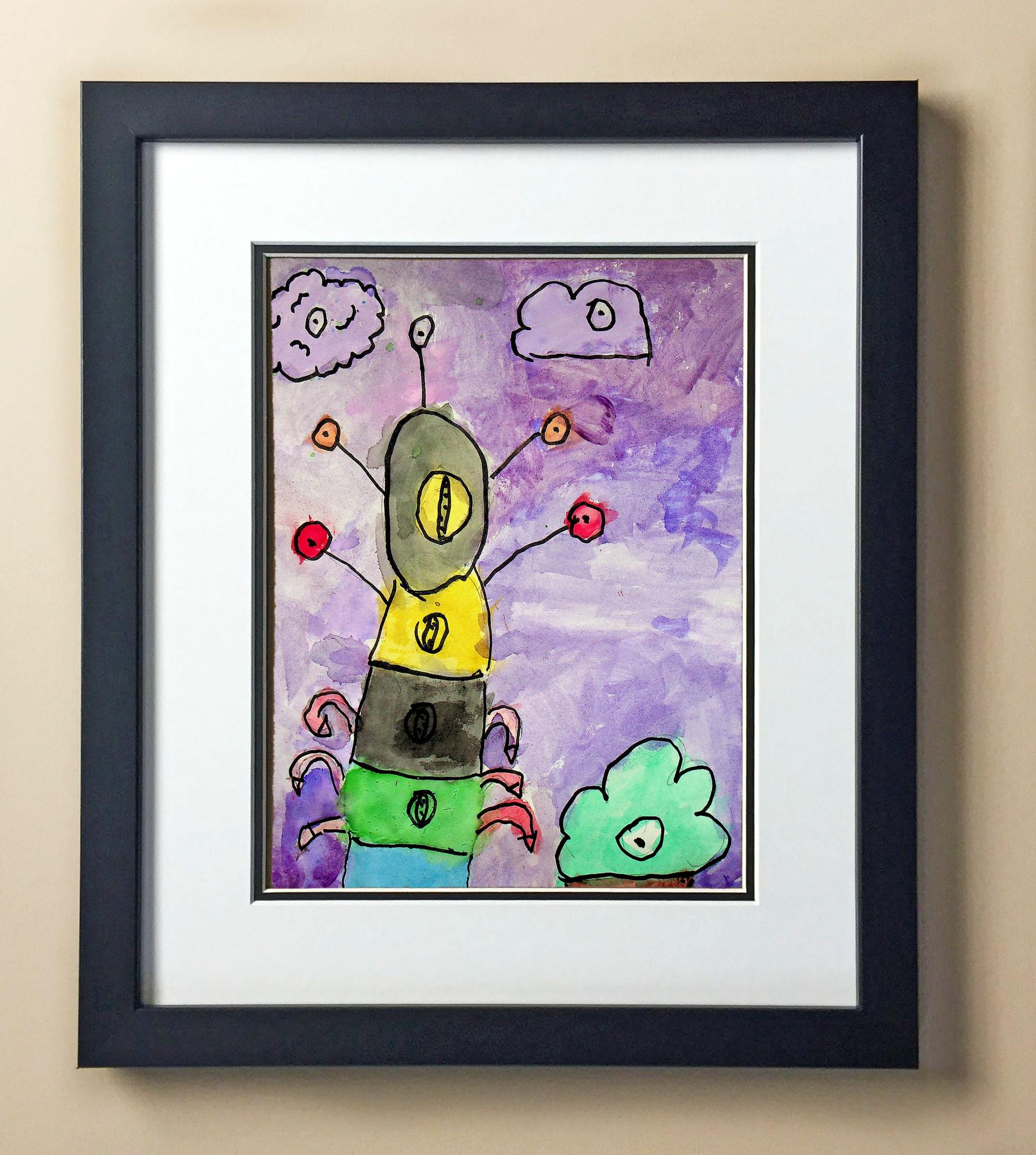 Included with the purchase is the Students Artwork, Frame, double matboard, shatter proof plexiglass, and a ready to hang backerboard with turnbuttons