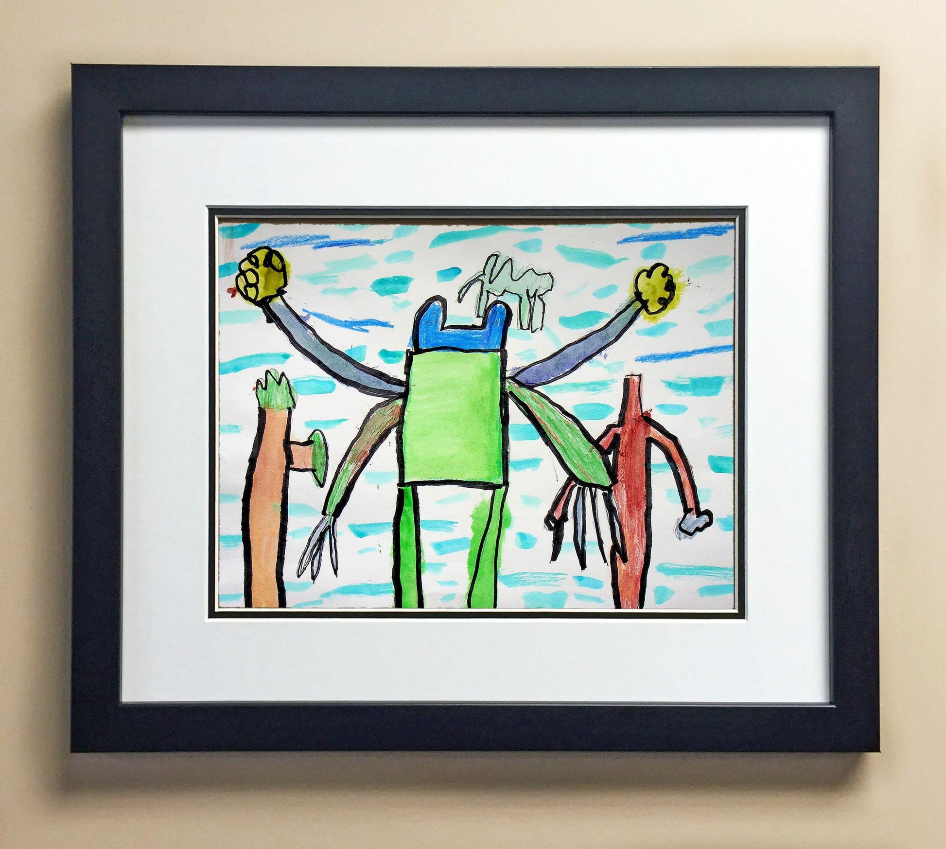 Included with the purchase is the Students Artwork, Frame, double matboard, shatter proof plexiglass, and a ready to hang backerboard with turnbuttons
