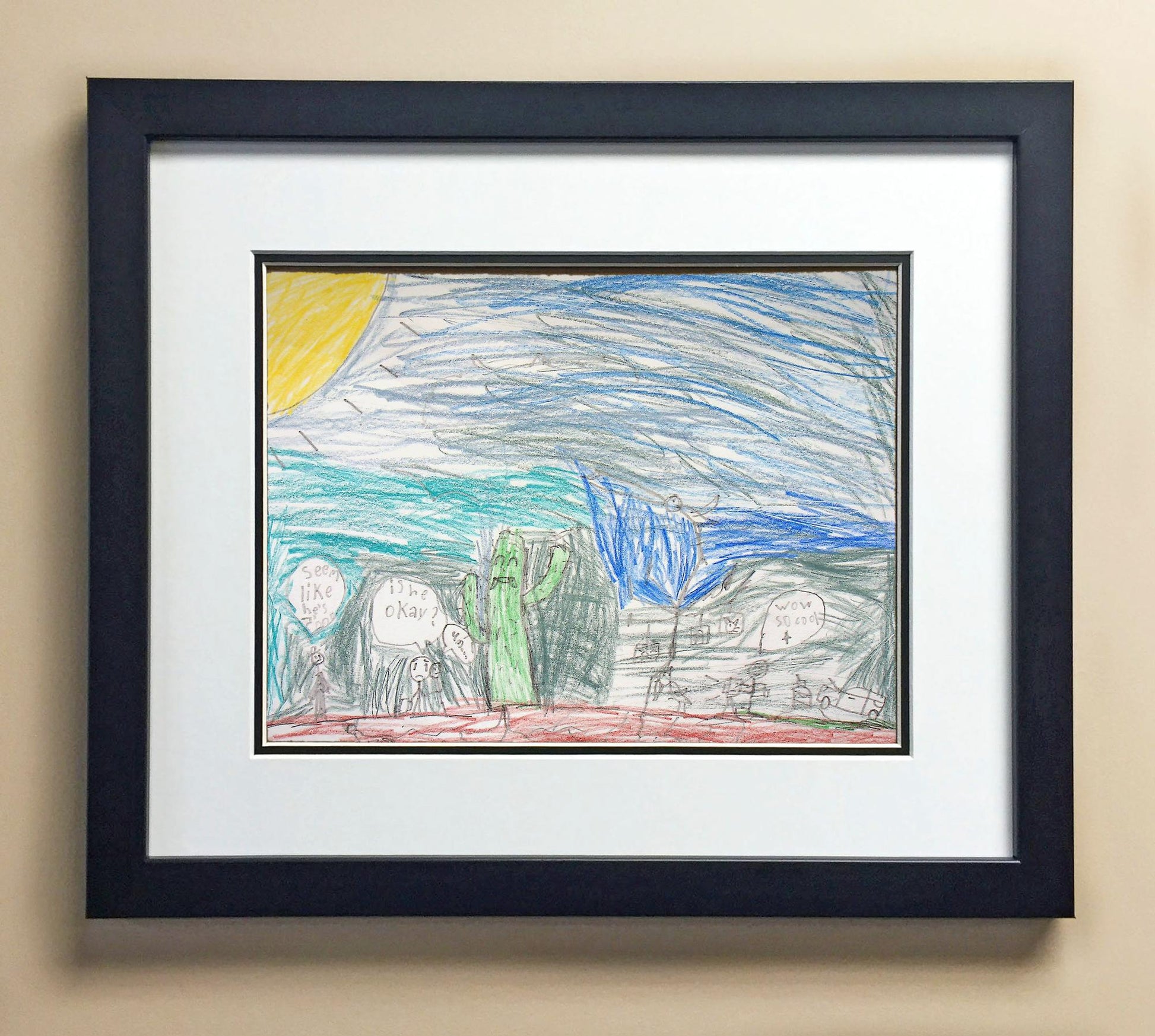 Included with the purchase is the Students Artwork, Frame, double matboard, shatter proof plexiglass, and a ready to hang backerboard with turnbuttons