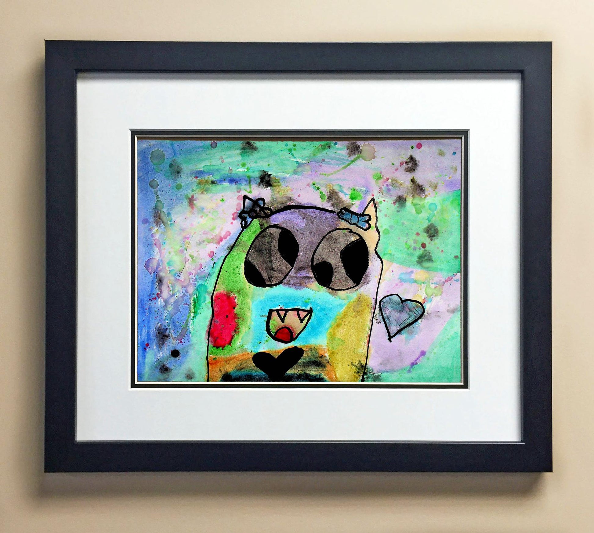 Included with the purchase is the Students Artwork, Frame, double matboard, shatter proof plexiglass, and a ready to hang backerboard with turnbuttons