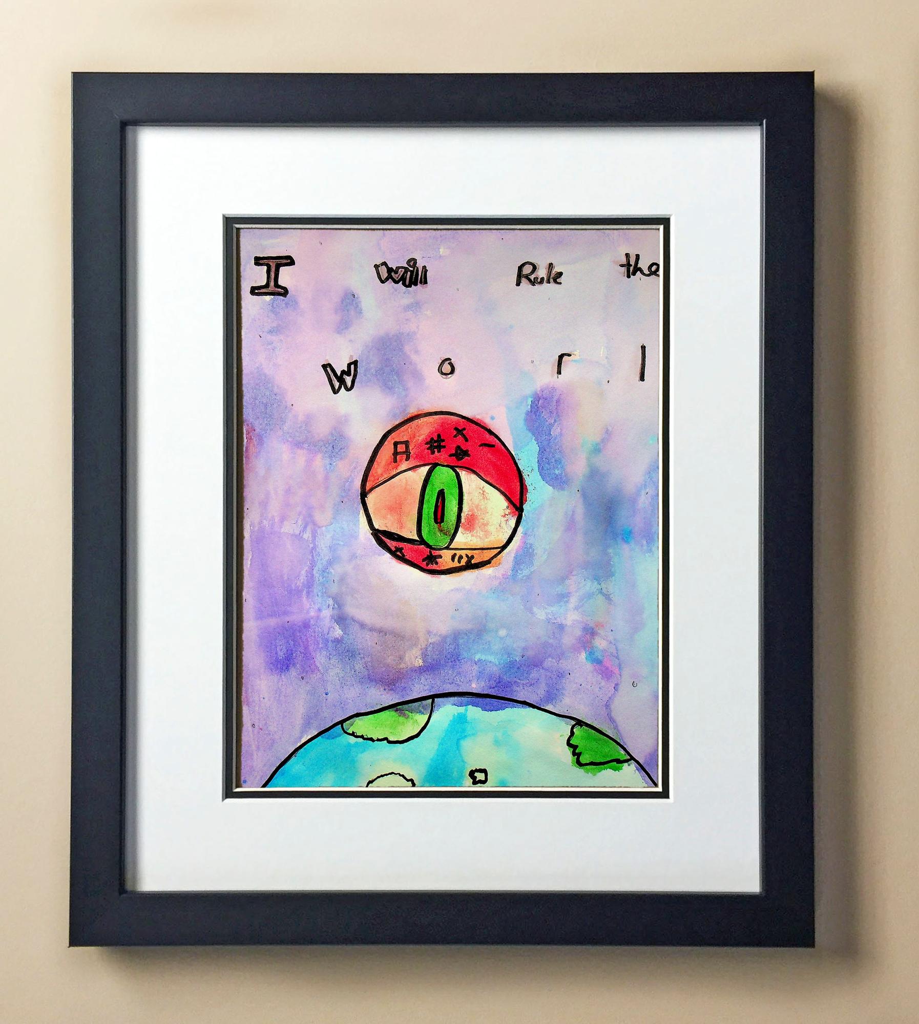 Included with the purchase is the Students Artwork, Frame, double matboard, shatter proof plexiglass, and a ready to hang backerboard with turnbuttons