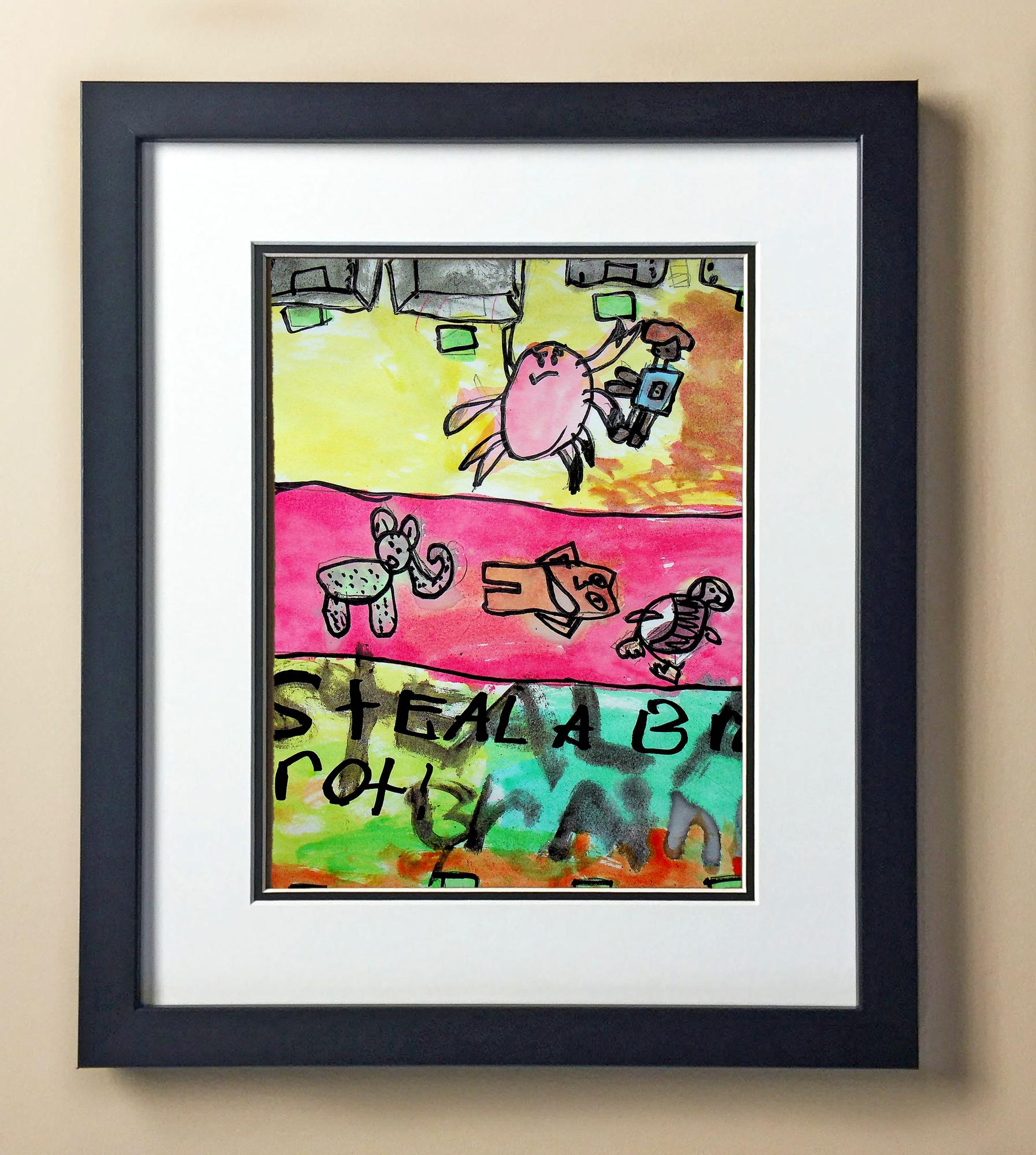 Included with the purchase is the Students Artwork, Frame, double matboard, shatter proof plexiglass, and a ready to hang backerboard with turnbuttons