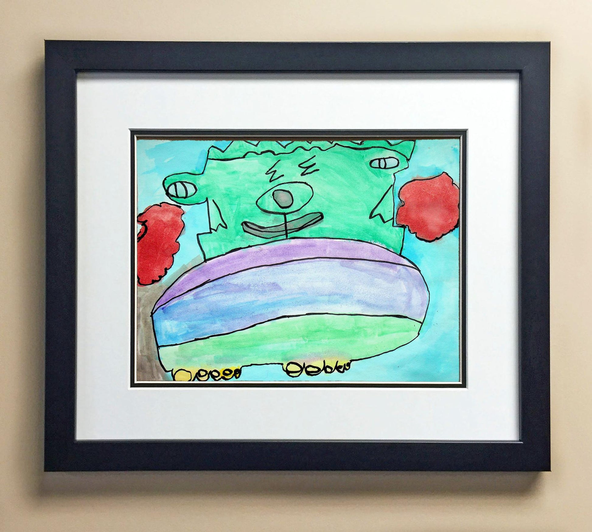 Included with the purchase is the Students Artwork, Frame, double matboard, shatter proof plexiglass, and a ready to hang backerboard with turnbuttons