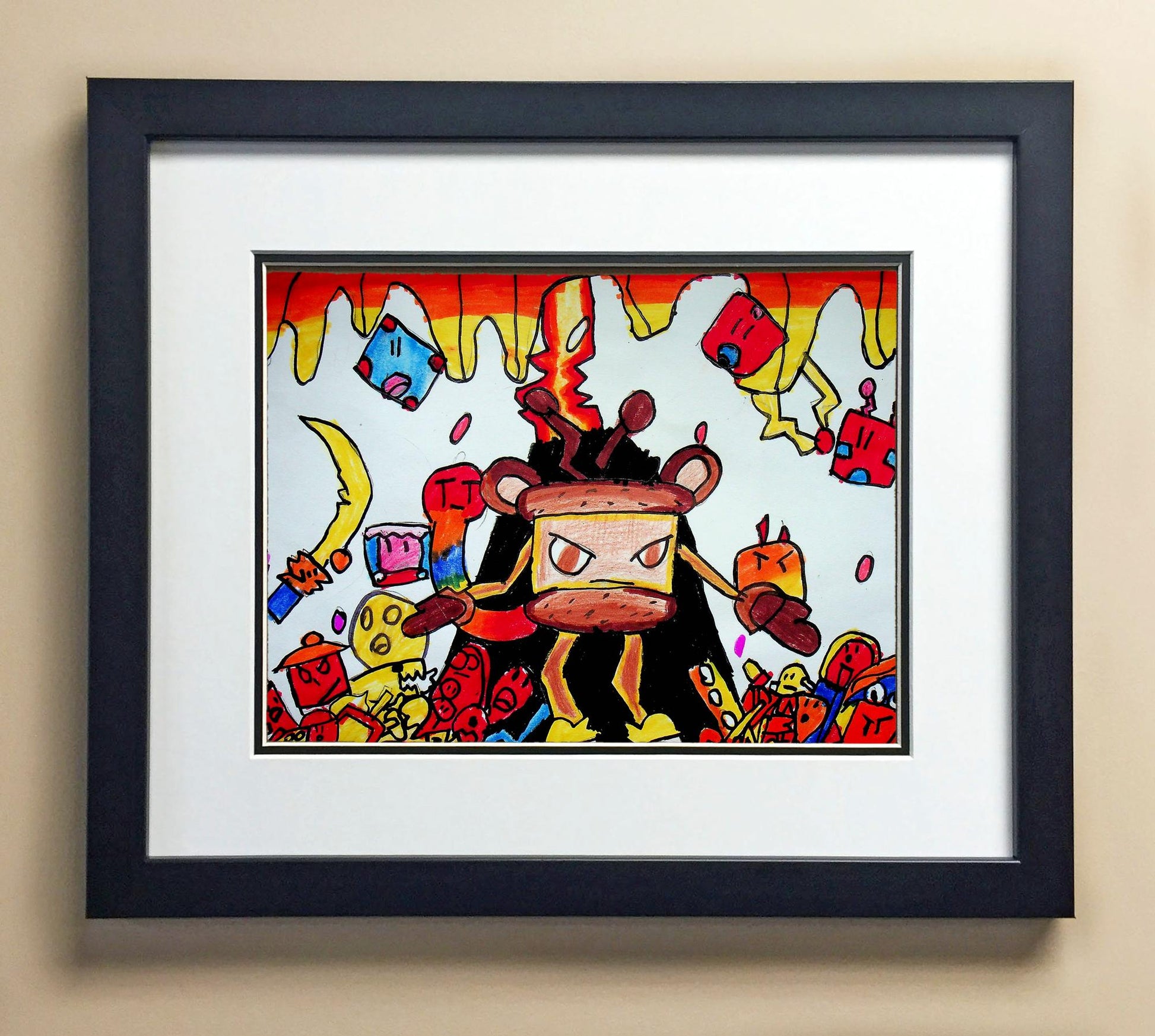 Included with the purchase is the Students Artwork, Frame, double matboard, shatter proof plexiglass, and a ready to hang backerboard with turnbuttons