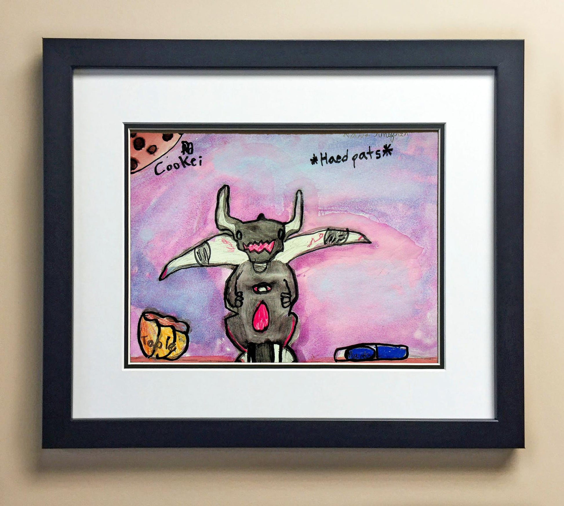 Included with the purchase is the Students Artwork, Frame, double matboard, shatter proof plexiglass, and a ready to hang backerboard with turnbuttons