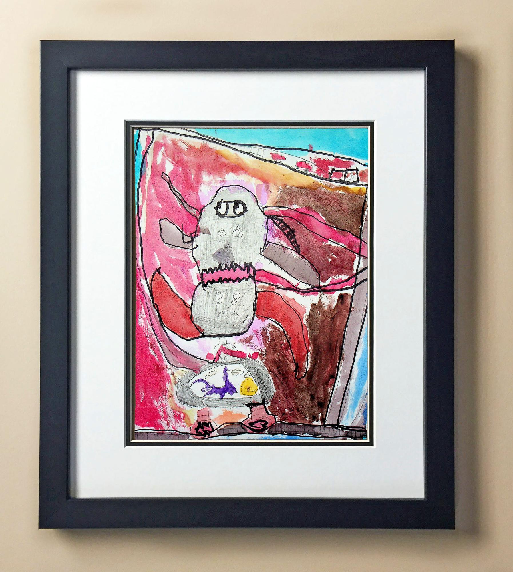 Included with the purchase is the Students Artwork, Frame, double matboard, shatter proof plexiglass, and a ready to hang backerboard with turnbuttons