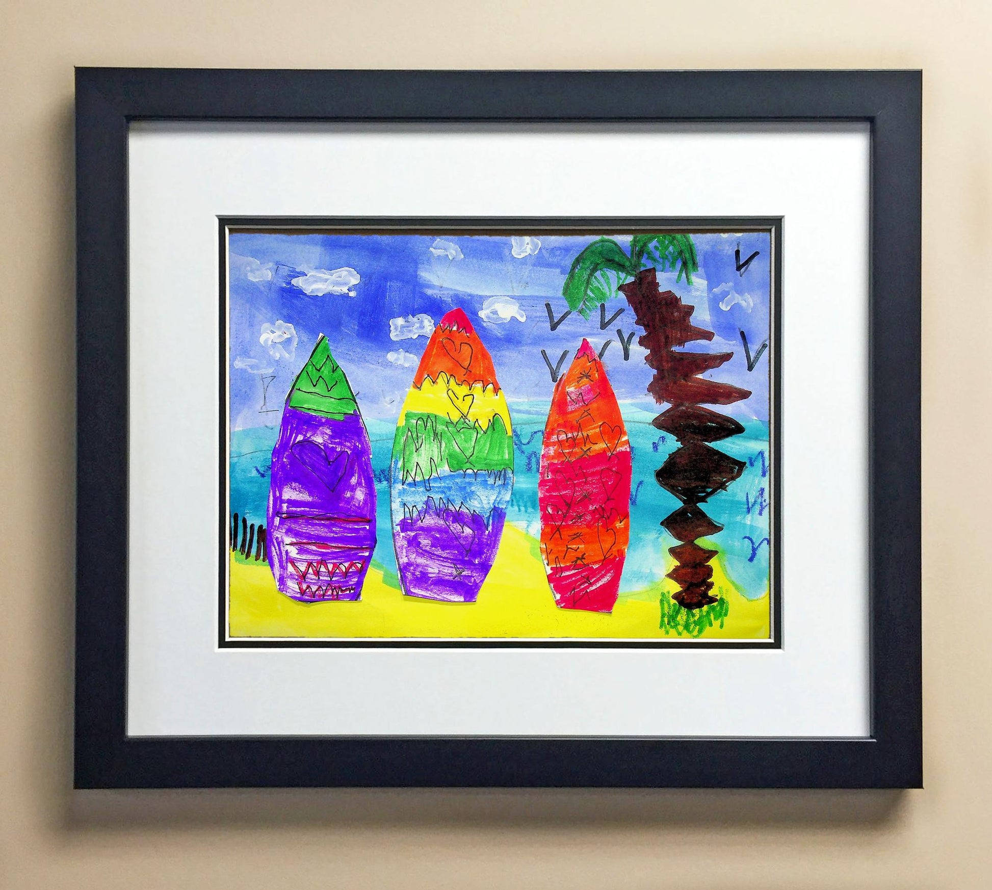 Included with the purchase is the Students Artwork, Frame, double matboard, shatter proof plexiglass, and a ready to hang backerboard with turnbuttons